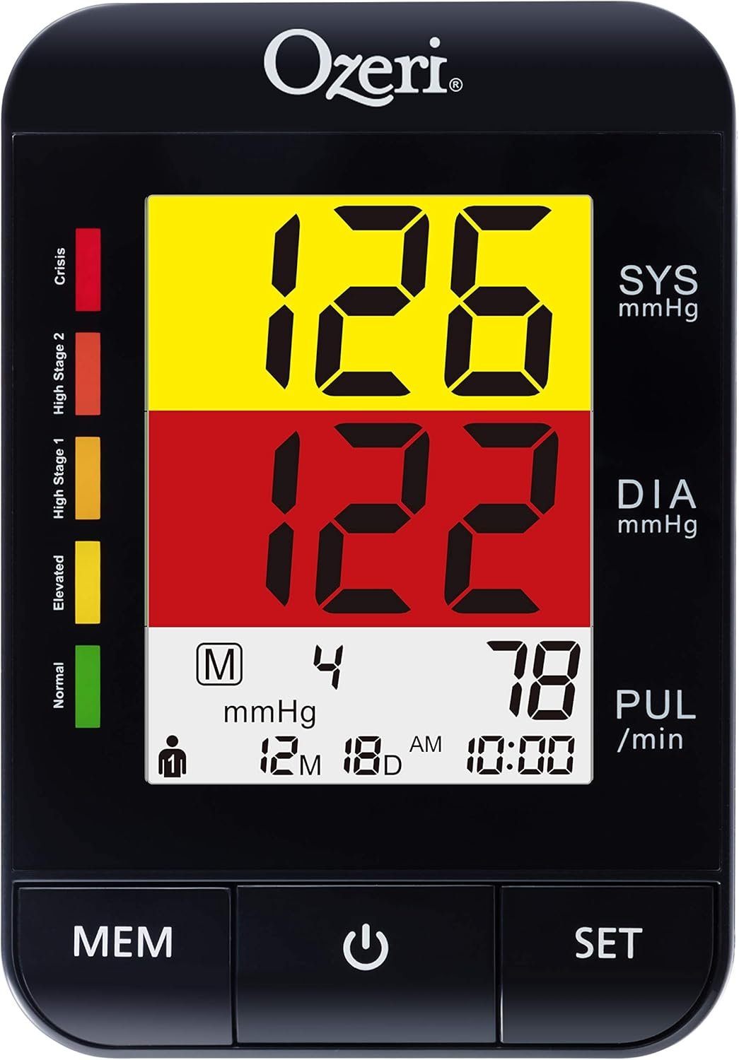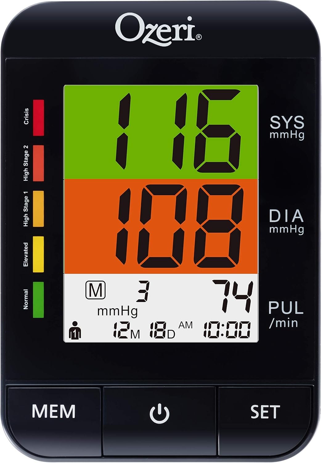 Utilizes a split-screen LCD to take the worry out of interpreting numbers with 5 intuitive Sys and dia colors from Green (normal) to red (crisis).