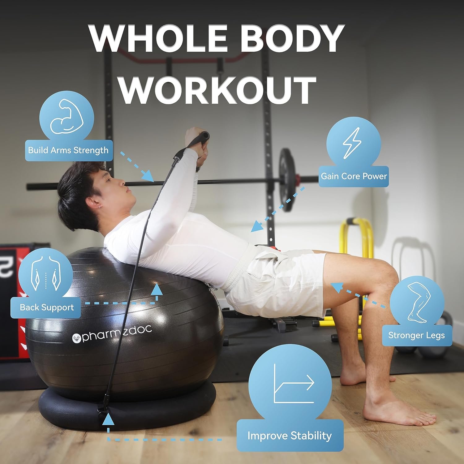 Versatile Exercise Equipment: Yoga ball chair with base and bands can be used for various exercises like yoga, Pilates, stretching, physical therapy and strength training.