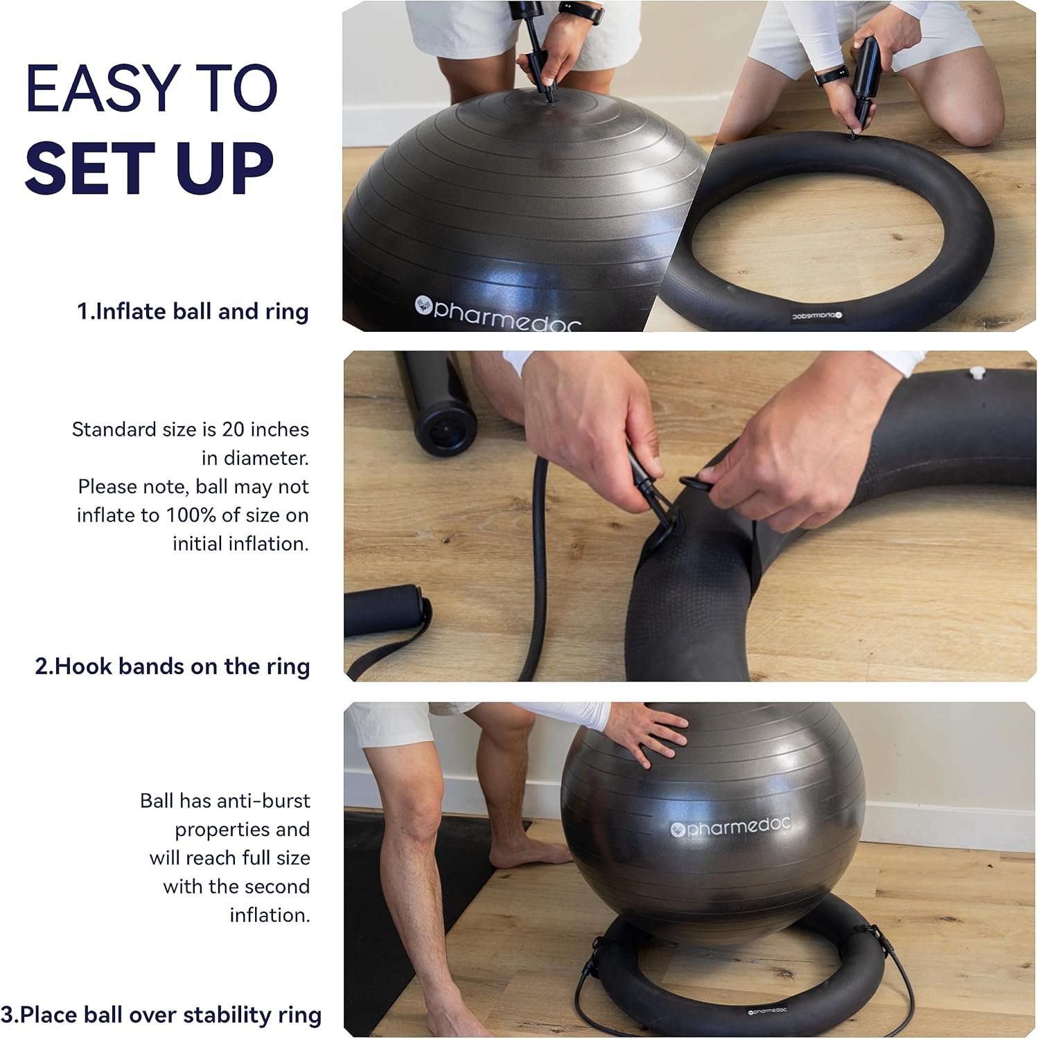 Please note: Ball needs to be inflated to the correct size (20 inches) to work properly. Inflate the ball to about 80% of the recommended size firstly; leave on for 1-2 days, then inflate to the recommended size. Inflate the ring base the same way as for proper use.