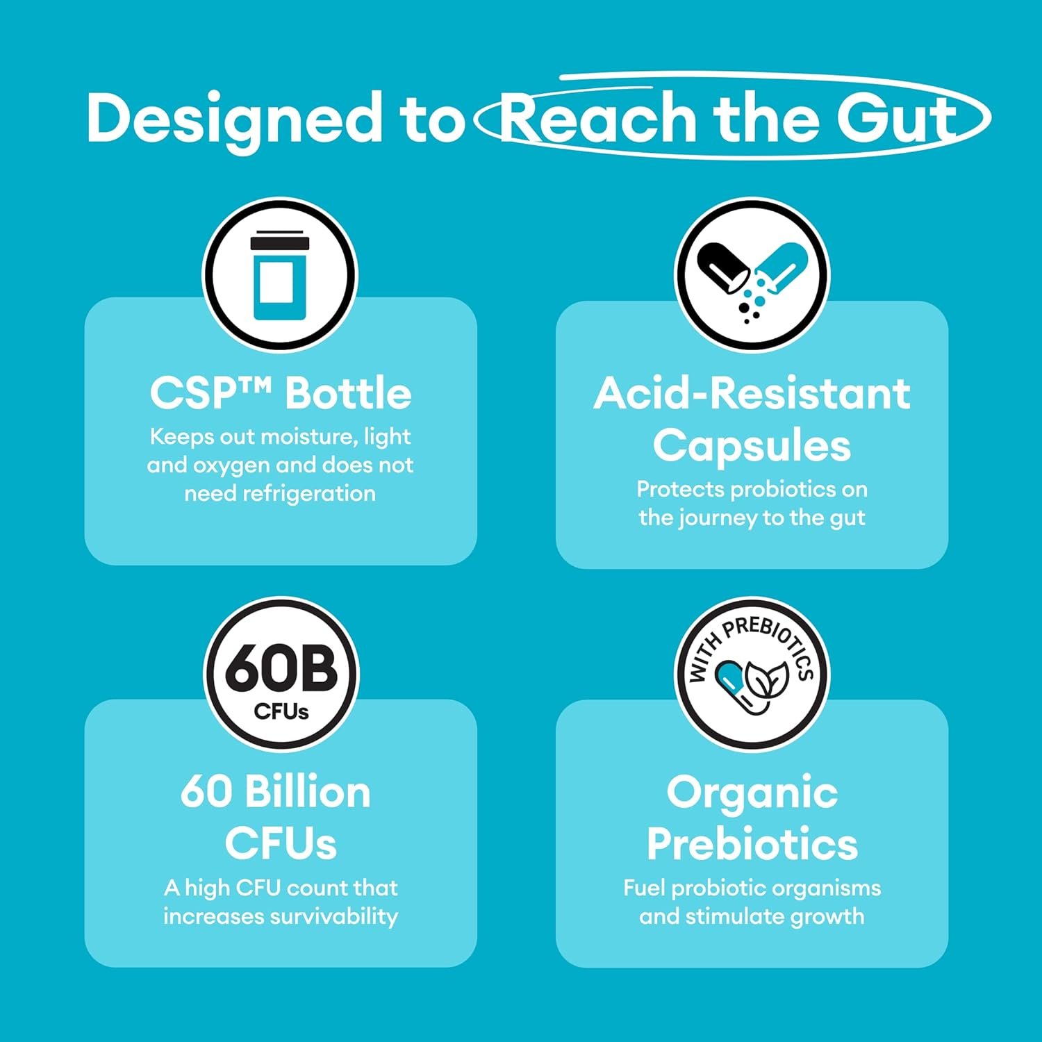 Survives the Gut: From start to finish – this probiotic is designed to survive the gut & maximize the colonization of our strains. We use a shelf-stable bottle, acid-resistant capsules, and 60 Billion Colony forming units (CFU) to achieve this!
