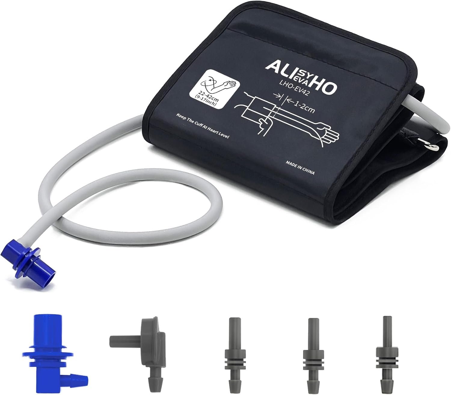 “Product Description How to use: 1. Keep the lower edge of the cuff 0.8″”-1.2″” (2-3CM) . 2. The trachea is on the inside of the arm and aligned with the middle finger. 3. The cuff should be placed on the arm at the same level as the heart. 4. Leave some space between the cuff and the arm. Make sure one finger can be inserted. Precautions: The cuff is not placed in the correct position, which may affect the accuracy of the measurement. Tips: If damage is found, the cuff should be replaced in time. The cuff should also be replaced. If the monitoring device displays a message indicating an air leak. Cleaning and Disinfection: It can be cleaned with a damp cloth dampened with soapy water. It can be disinfected by wiping with 70% ethanol. *lf the connector that comes with the cuff is not suitable for your machine.Please replace with the connector of your blood pressure monitor.”