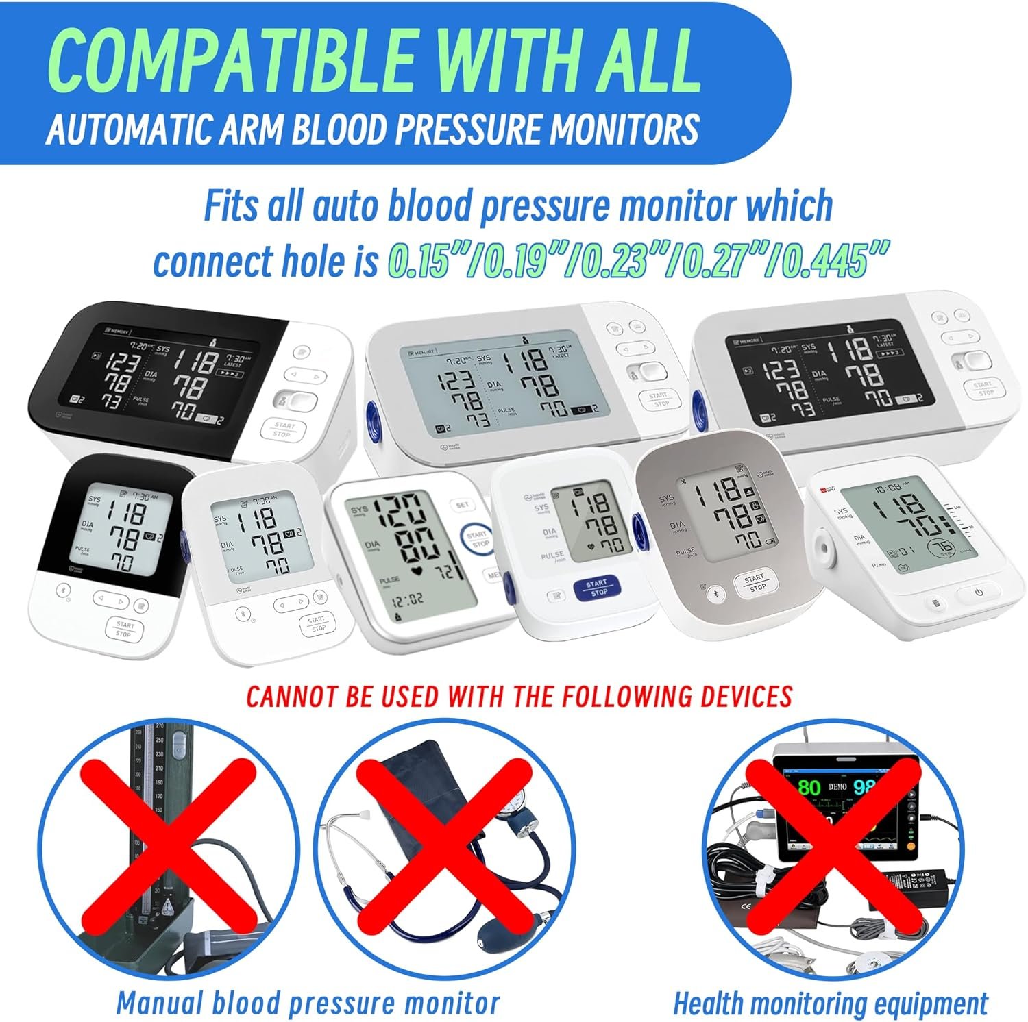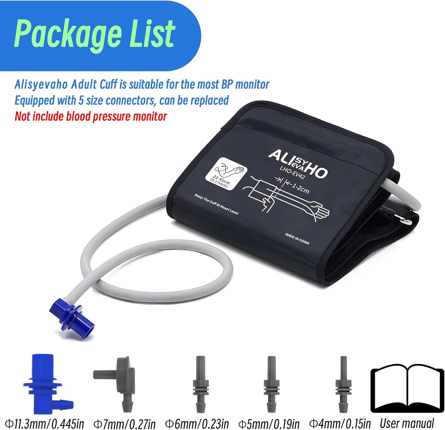 【Complete Accessories】High-quality replacement cuff, 4mm connector, 5mm connector, 6mm connector, 7mm connector, 11.3mm connector, quick user guide.