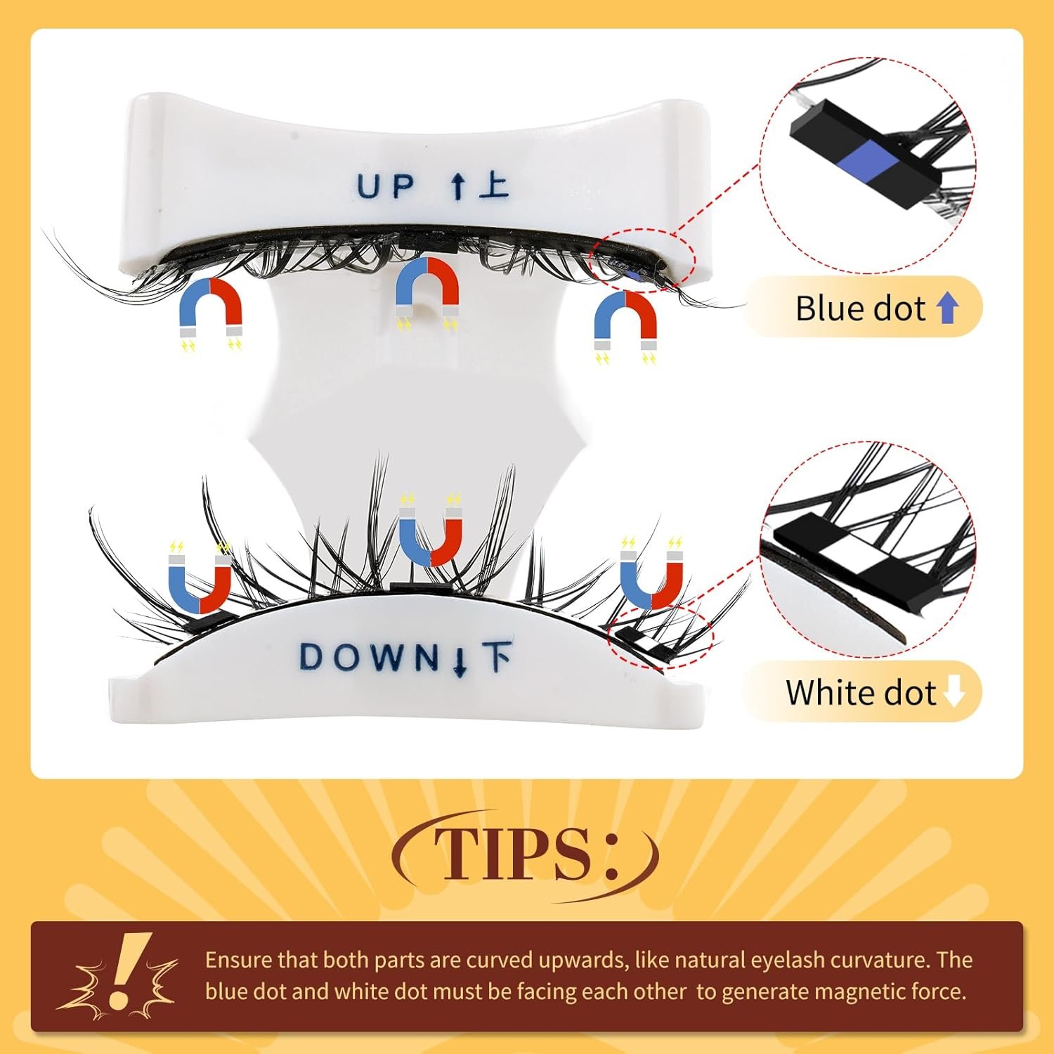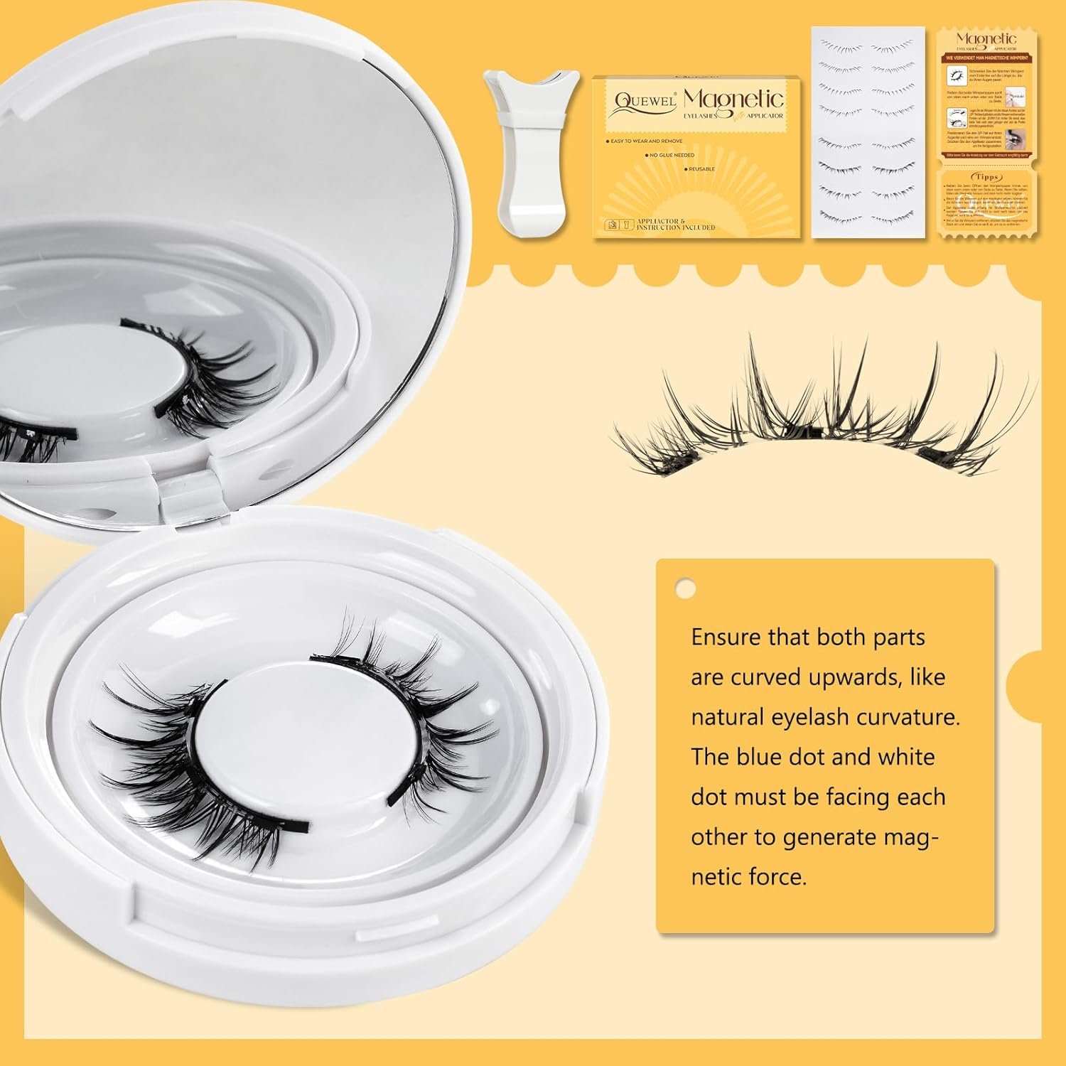 Magnetic Eyelashes Kit: The magnetic lashes kit includes 1 pair of magnetic eyelashes, 1 magnetic applicator, 1 small magnetic box with a mirror, and one instruction sheet. Magnetic lashes are easy to operate and only take 1 minute to complete, effectively saving your makeup time and allowing you to stay on through an entire sweaty rave!