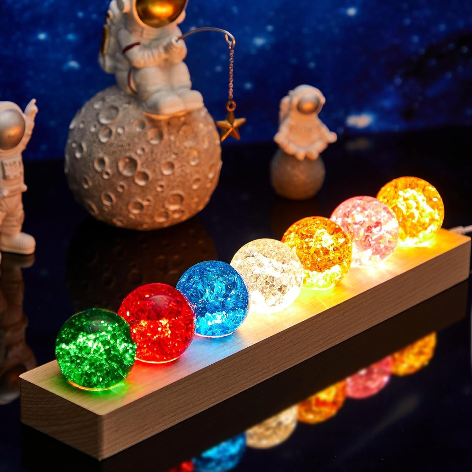 Magnificent Addition to Home Decor: introduce an element of serenity to your living spaces with our 7 chakra natural healing spheres with a LED wooden stand; The spheres radiate with bright colors, accentuating the beauty of your surroundings