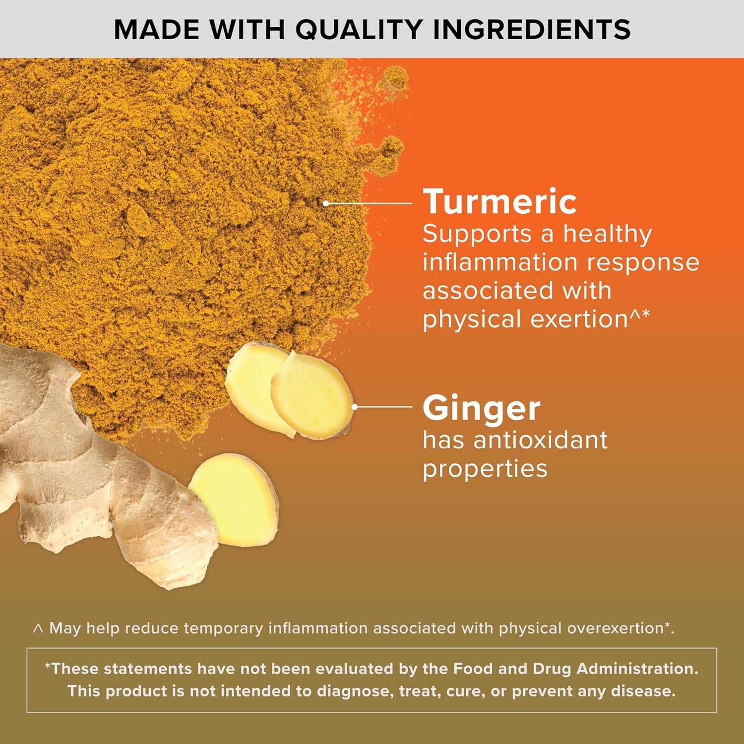 ANTIOXIDANT – Turmeric provides one of nature’s best kept secrets, curcuminoids, a group of antioxidants that helps provide positive effects on inflammation brought on by physical overexertion. Try them after a workout