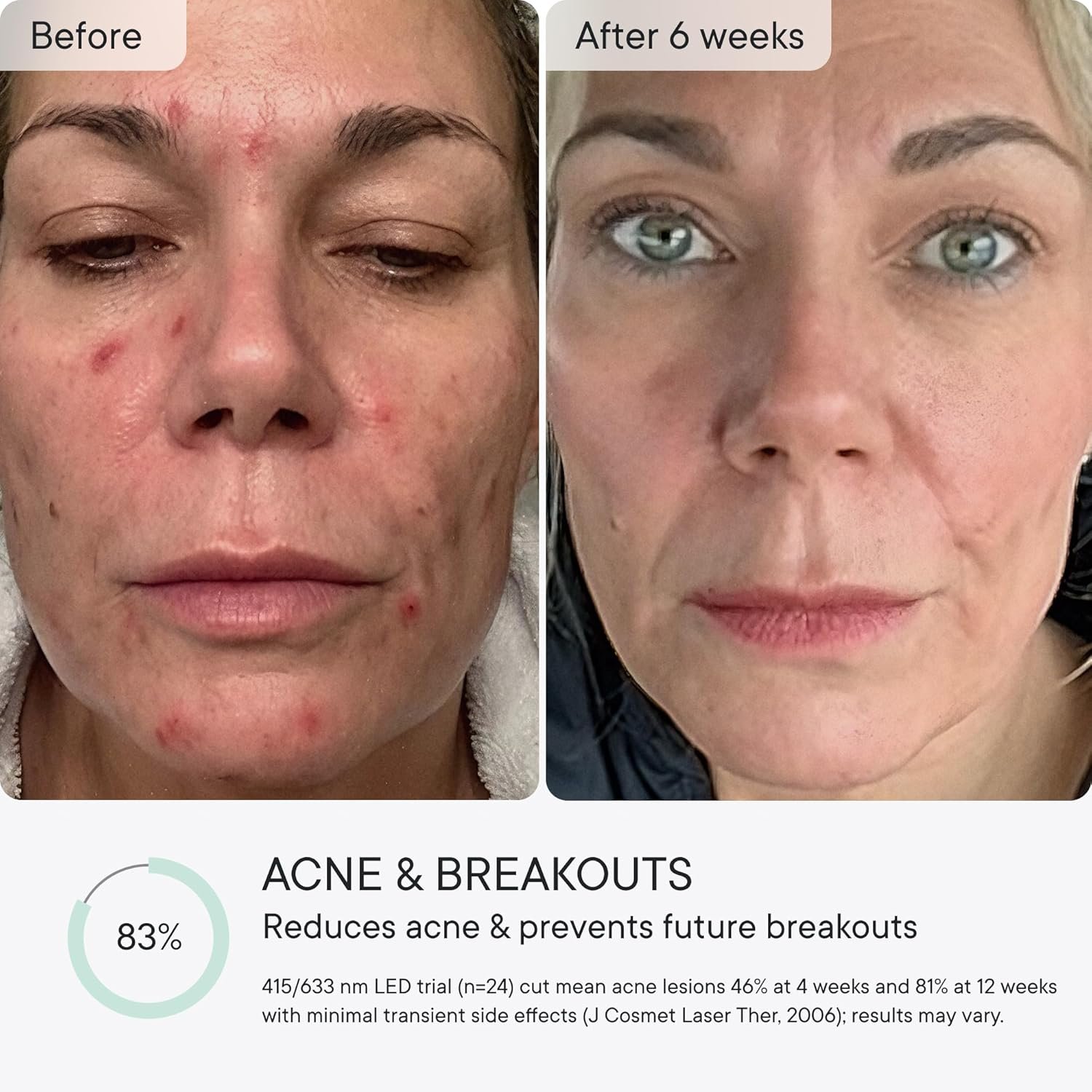 5 CLINICALLY-PROVEN WAVELENGTHS: Amber 605 nm, Red 630 nm, Deep Red 660 nm, Blue 415 nm, and Infrared 880 nm target collagen, pigmentation, bacteria and redness for firmer, clearer, more even skin.
