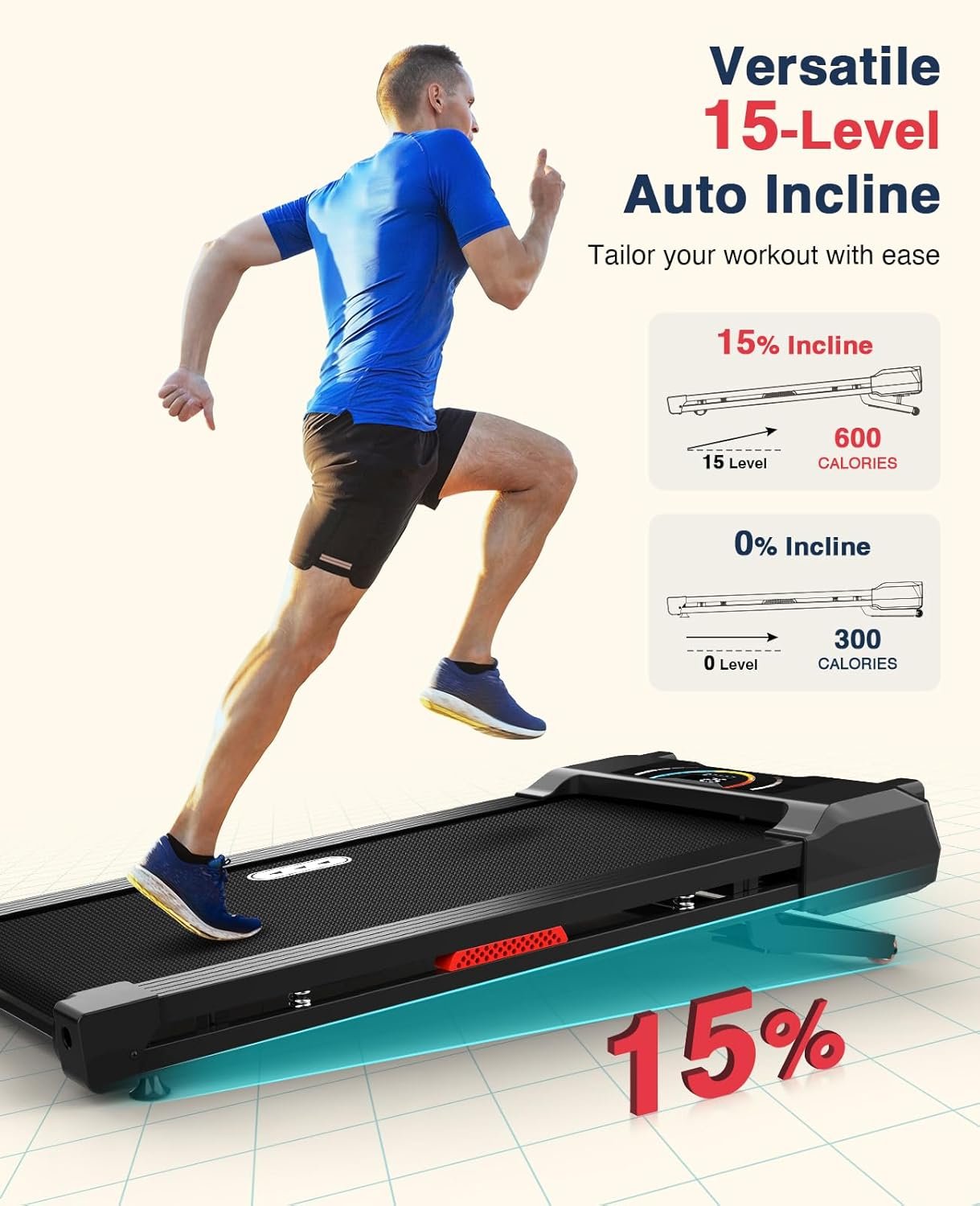 [Auto Incline Adjustment] – Enjoy customizable workouts with the walking pad treadmill 15 degree incline, enhancing fat-burning potential and muscle toning without manual adjustments.