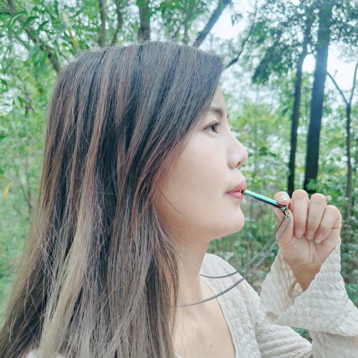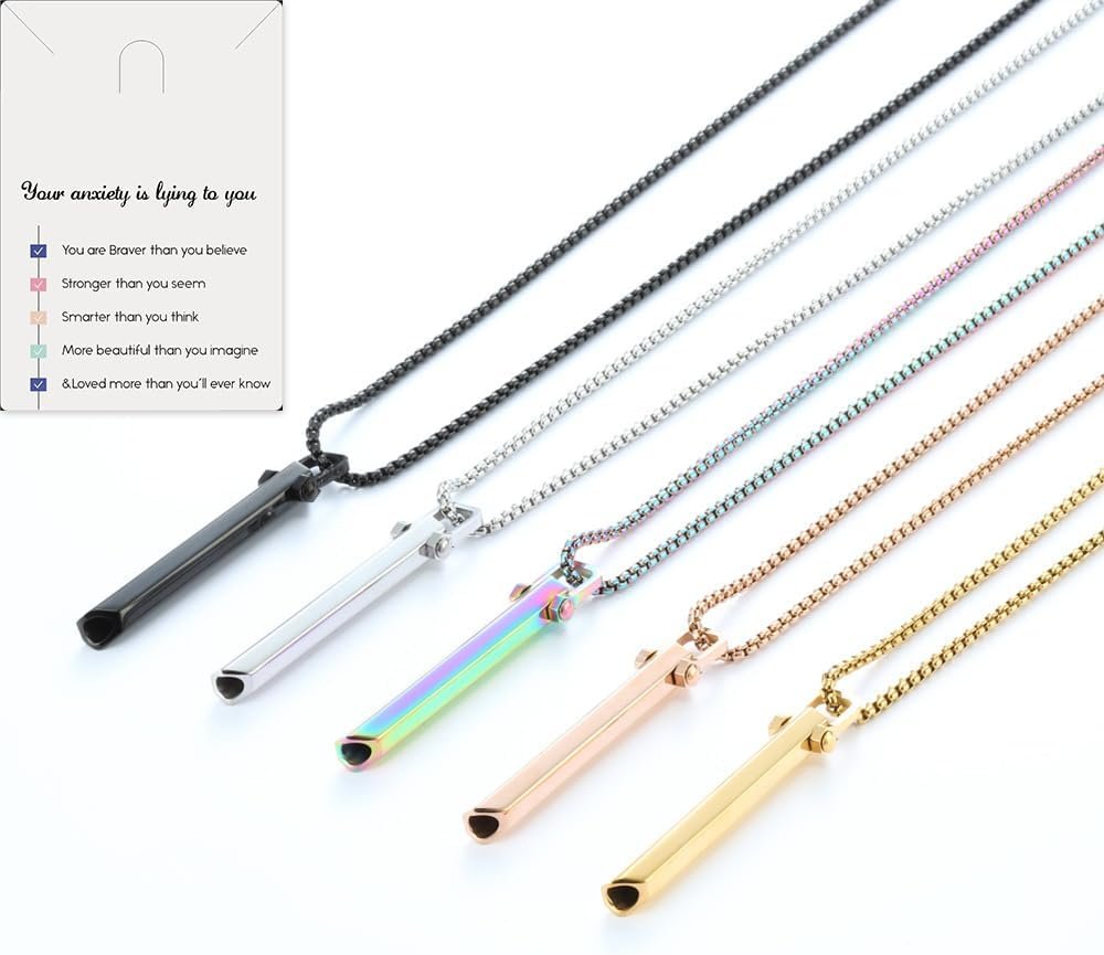 Our Cosfog Breathing Necklace, a stylish and functional mindfulness tool designed to help you navigate the stresses of everyday life. With its unique hexagonal geometric design, this necklace stands out as a fashion statement while serving a higher purpose. Crafted from premium stainless steel, the Cosfog Breathing Necklace is built to withstand the test of time, making it a reliable companion on your mindfulness journey. More than just an accessory, it doubles as an anxiety relief tool, helping you naturally decompress and unwind whenever stress starts to creep in. How to use: To harness the full potential of this necklace, simply inhale through your nose for 4 seconds, hold your breath for 7 seconds, and exhale fully through the pendant for 8 seconds, making sure to empty your lungs completely. Repeat this process a few times until you feel calm and relaxed. If you find this breathing pattern to be too long, you can opt for a shorter version: inhale for 2 seconds, hold for 3-4 seconds, and exhale through the necklace for 4 seconds. Repeat this sequence until you achieve a state of calm. Whether you’re seeking a thoughtful gift for a loved one or treating yourself to a moment of peace, the Cosfog Breathing Necklace is a versatile choice suitable for both women and men. Let it guide you towards a more mindful, relaxed life.