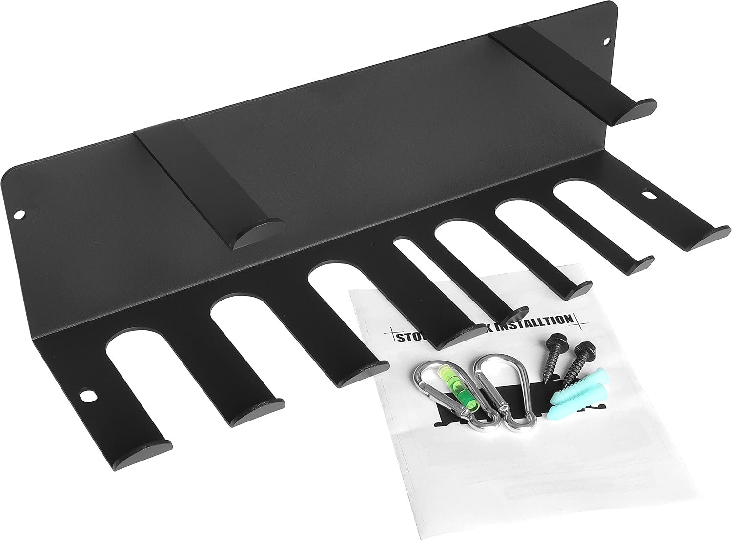 Prongs of different spacing and width can be used to place different fitness equipment, and the upper hook can be used to place yoga mats, foam rollers, storage bags and other items