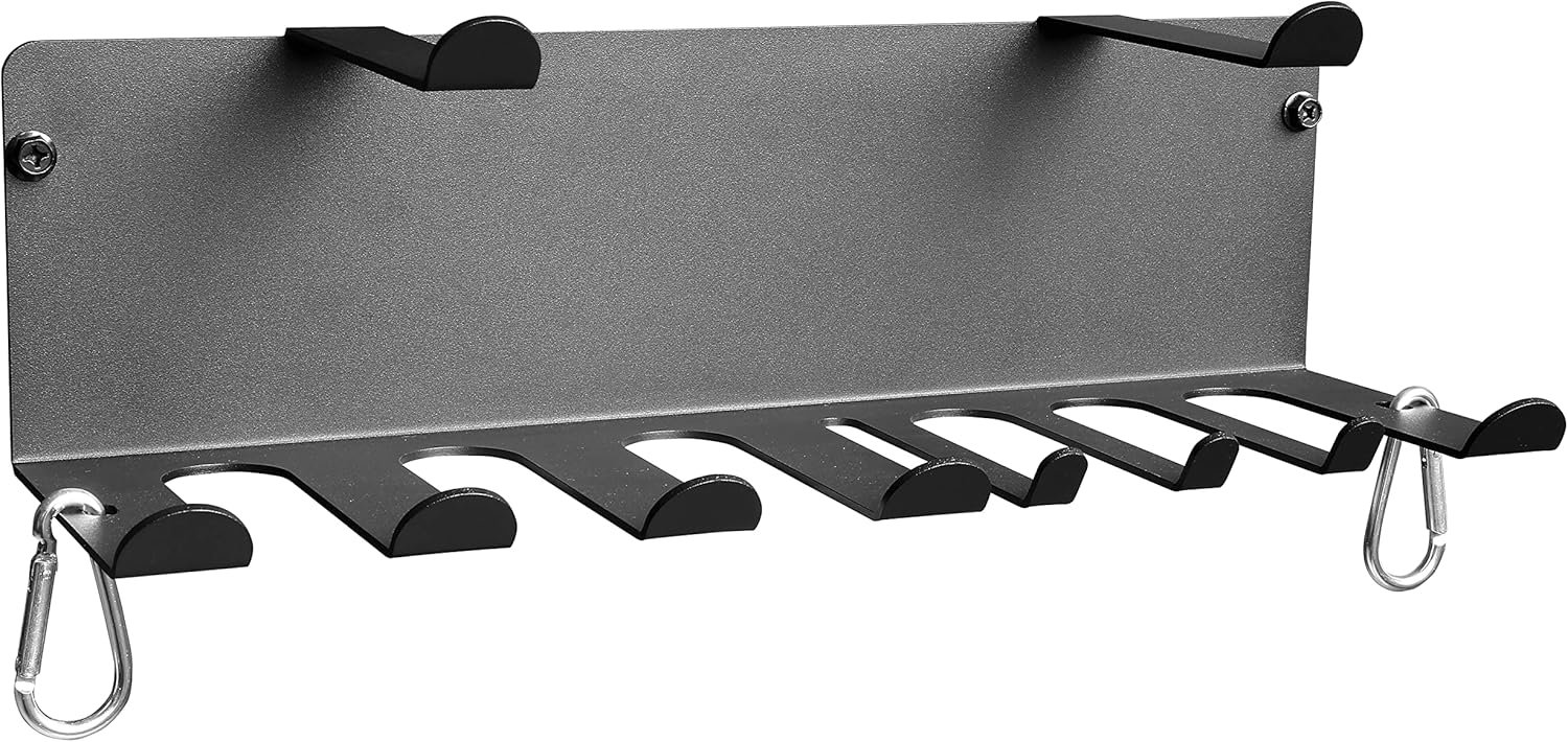 The size of the rack is 16.5″(L) x 5.5″(W) x 4.5″(H). 8 prongs and 2 foam rollers hooks can store a lot of fitness equipment