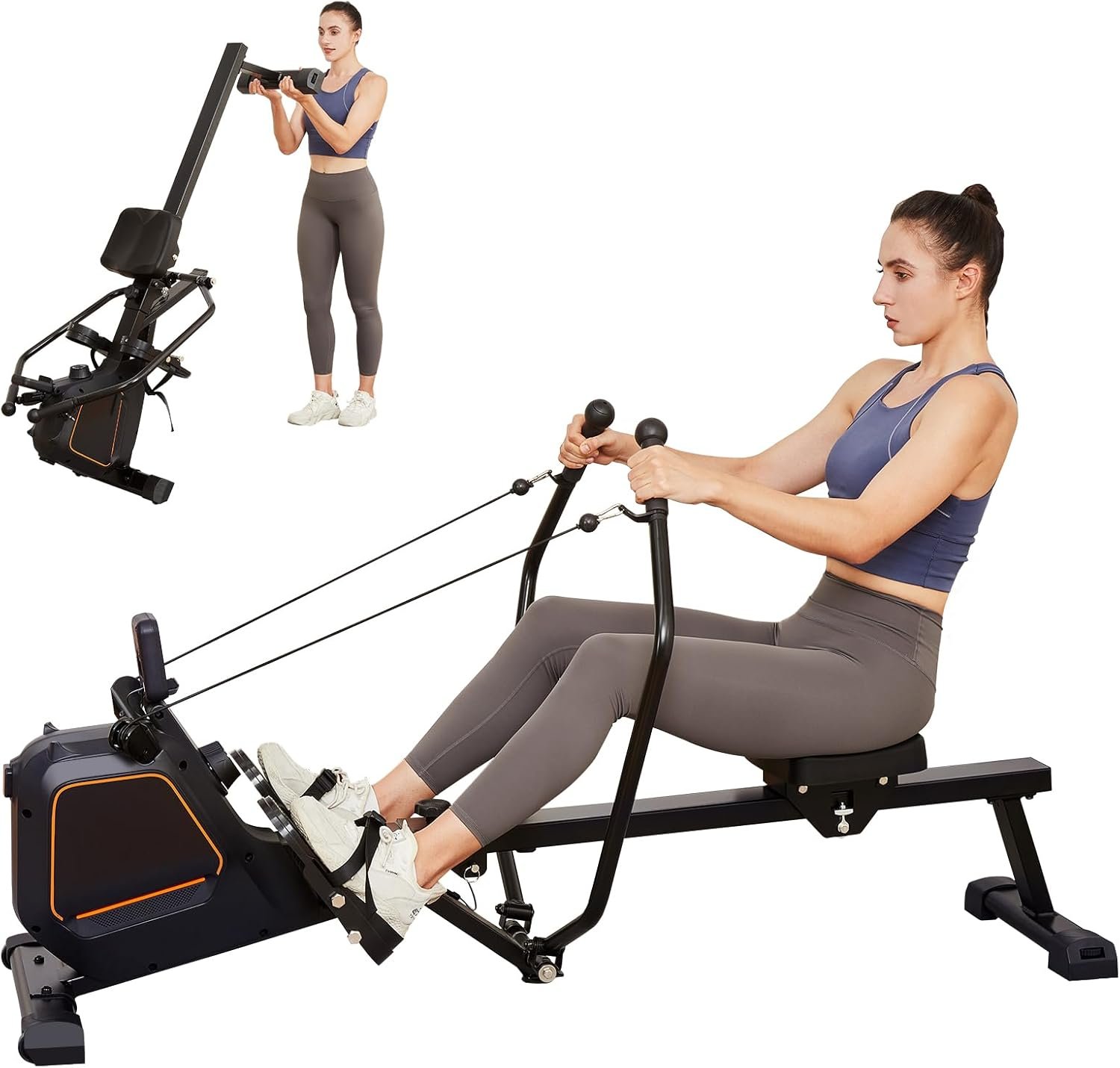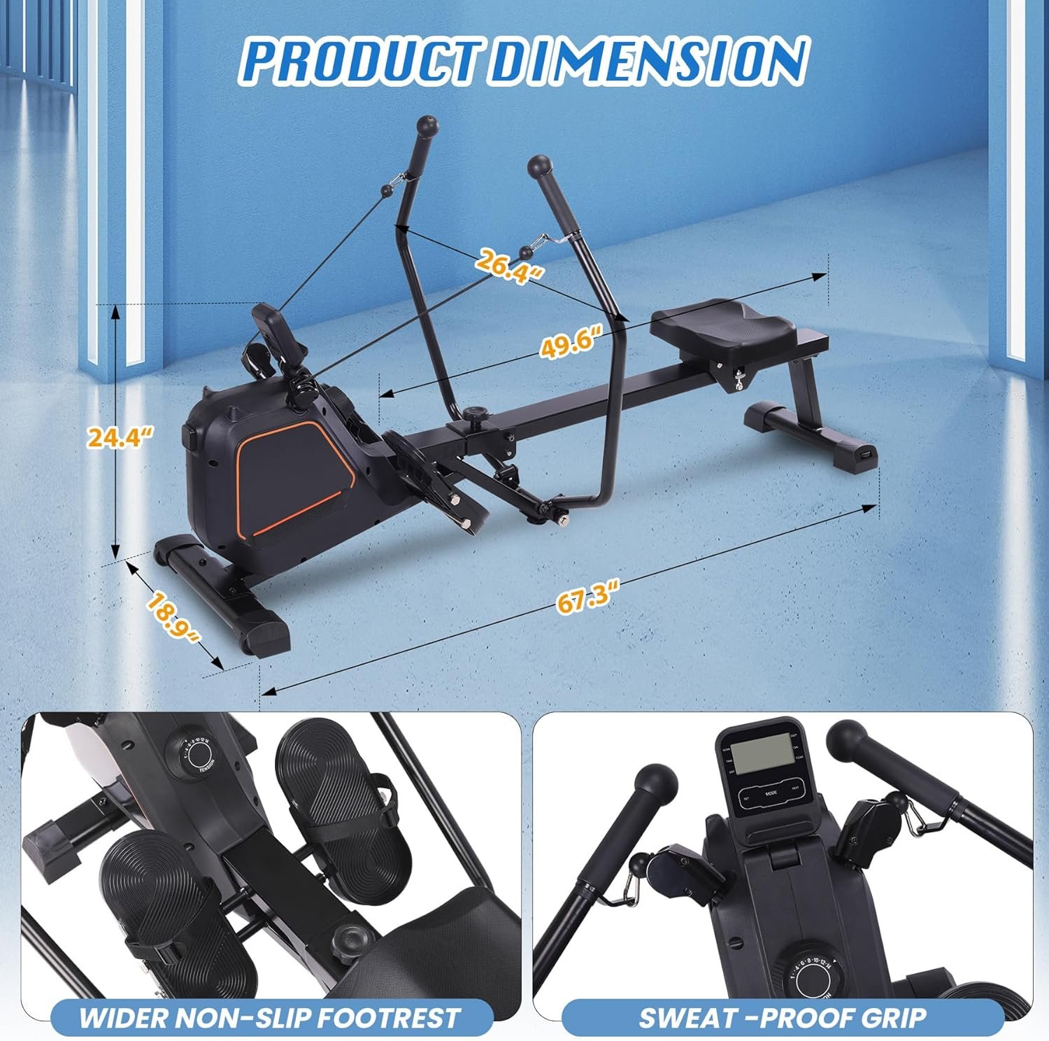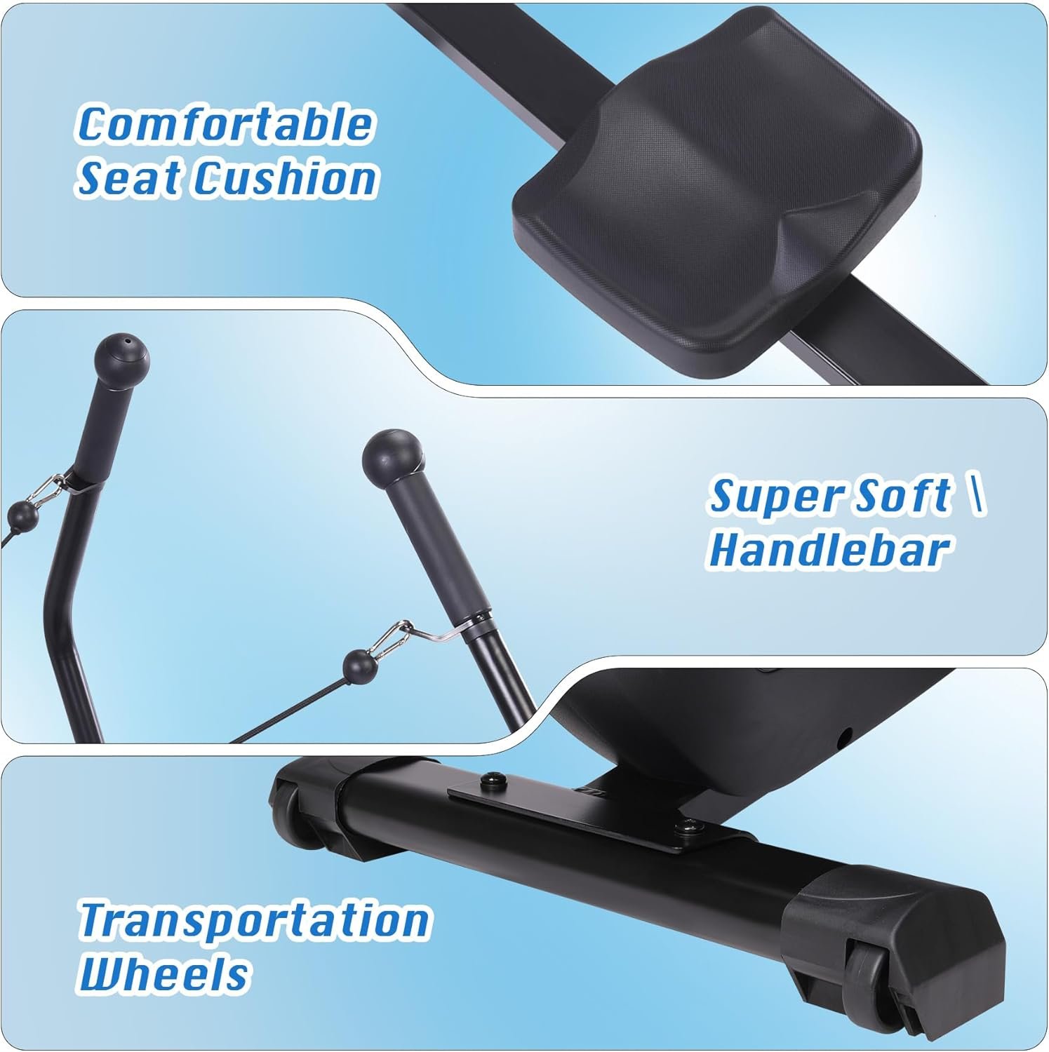 Simple and User-friendly Operation: Place this rowing machine on the floor and then sit down turning the resistance button to a suitable level of resistance. When you start exercising, the workout data would present itself and you can do the workout smoothly with durable and reliable rail system.
