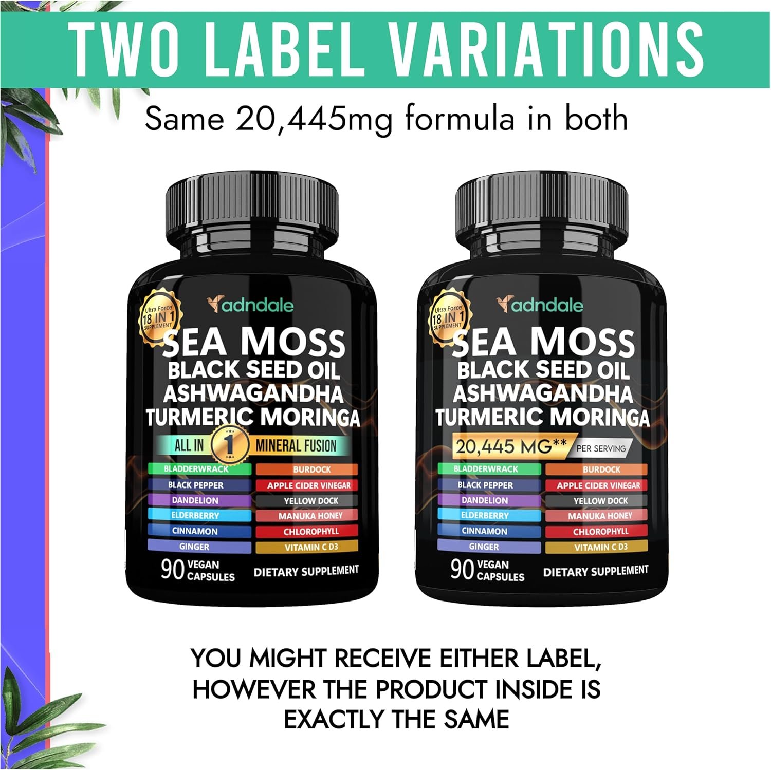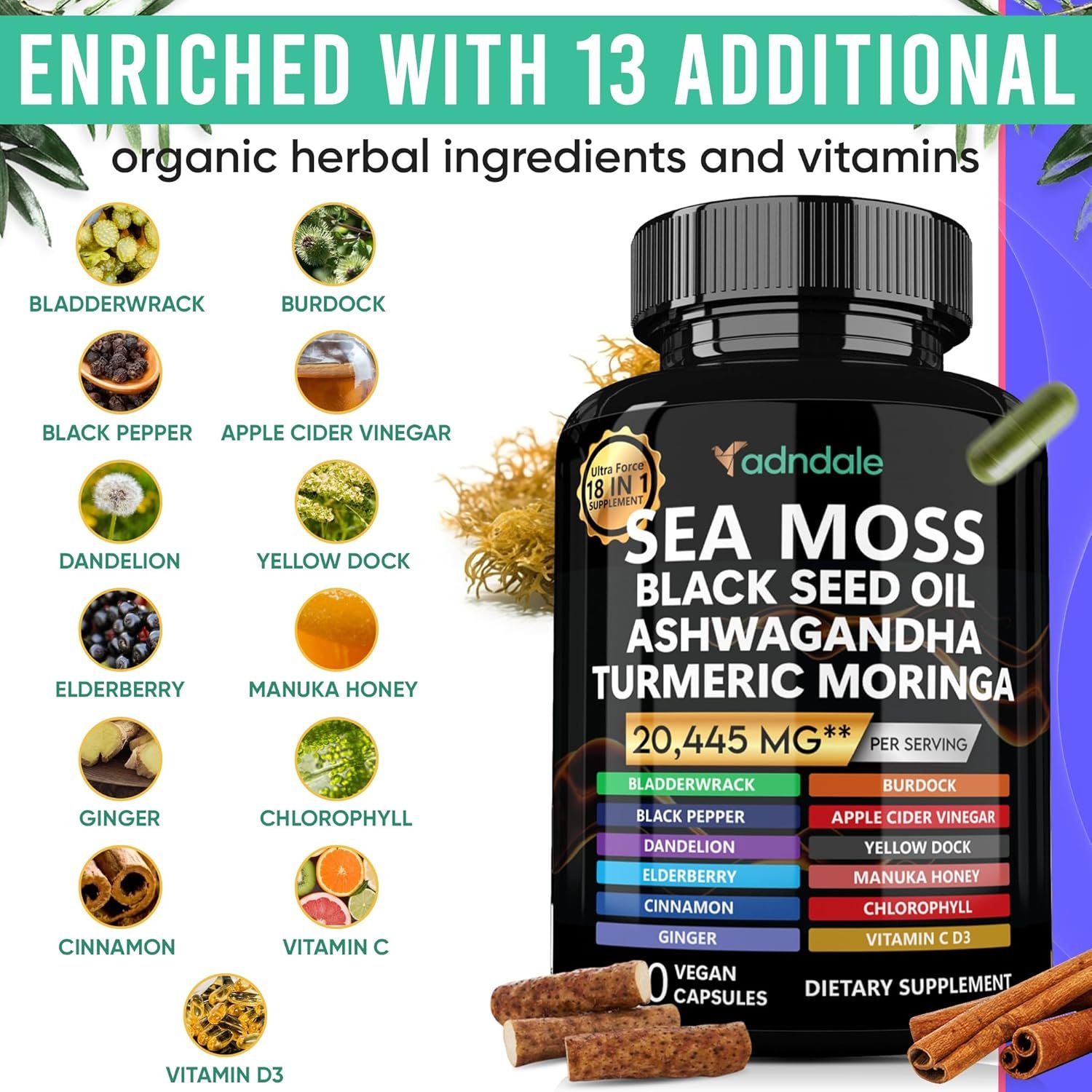 COMPREHENSIVE ULTRA FORCE 18-IN-1 SEA MOSS FUSION: Adndale proudly presents a groundbreaking supplement fusion led by Sea Moss, featuring a total of 18 potent ingredients in one powerful blend, providing energy, joint and cognitive function support. This comprehensive formula includes Sea Moss, Black Seed Oil, Ashwagandha, Ginger, Turmeric, Moringa, Bladderwrack, Burdock, Vitamin C, Vitamin D3, Black Pepper, Apple Cider Vinegar, Dandelion, Yellow Dock, Elderberry, Manuka Honey, Chlorophyll, and Cinnamon.
