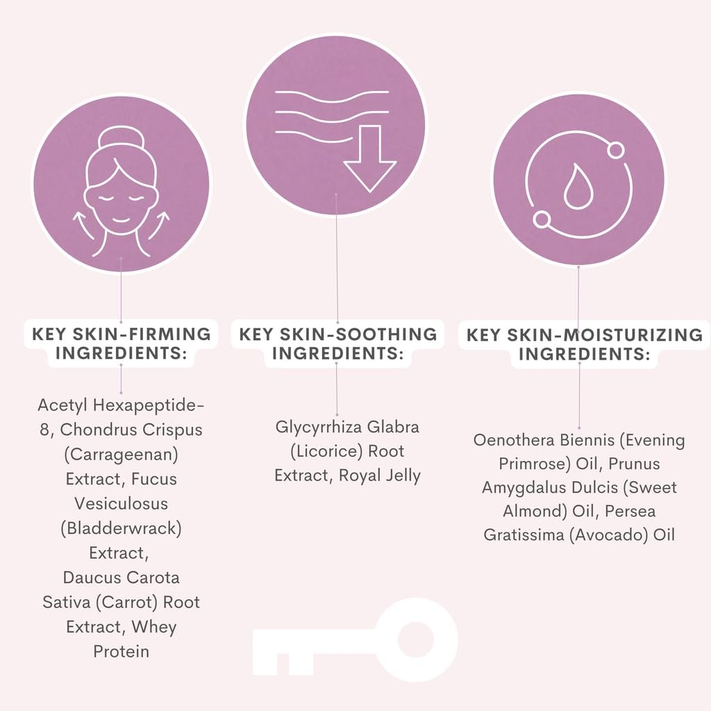 PEPTIDES – Powerful peptides relax over-active muscles and ease expression wrinkling. Superior water-binders provide instant hydration and reverse the effects of dry, dehydrated skin