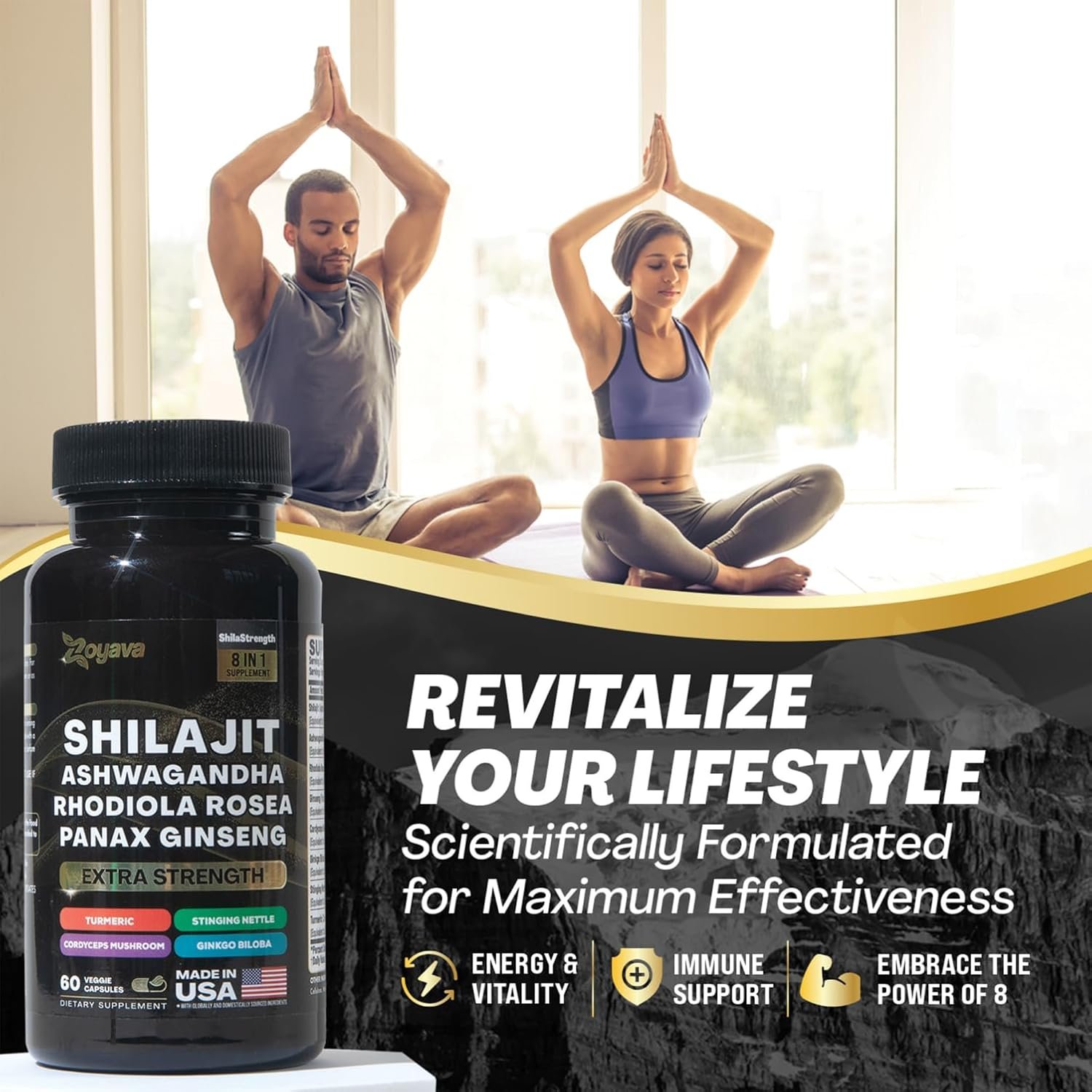 Packed with a potent blend of Shilajit Supplement, Ginkgo Biloba, Ashwagandha Capsules, Rhodiola Supplement, Panax Ginseng, Turmeric Powder, Stinging Nettle and Cordyceps Mushroom it offers an abundance of benefits. Say goodbye to the clutter of countless supplements in your cabinet and make room for a single solution. Zoyava presents a groundbreaking 8-in-1 formula Nature’s Synergy Solution