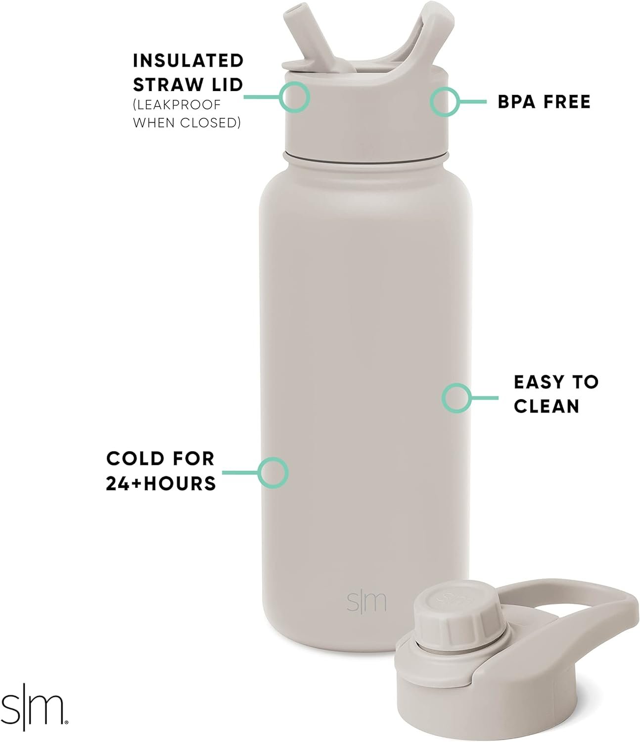 The Simple Modern Summit Water Bottle with Straw Lid and Chug lid comes with two different lid options to best fit your daily needs. The Straw Lid and Chug lids are both leak-proof and have a transport handle to keep you hydrated on the go. The bottle is made from double walled, vacuum insulated 18/8 stainless steel.