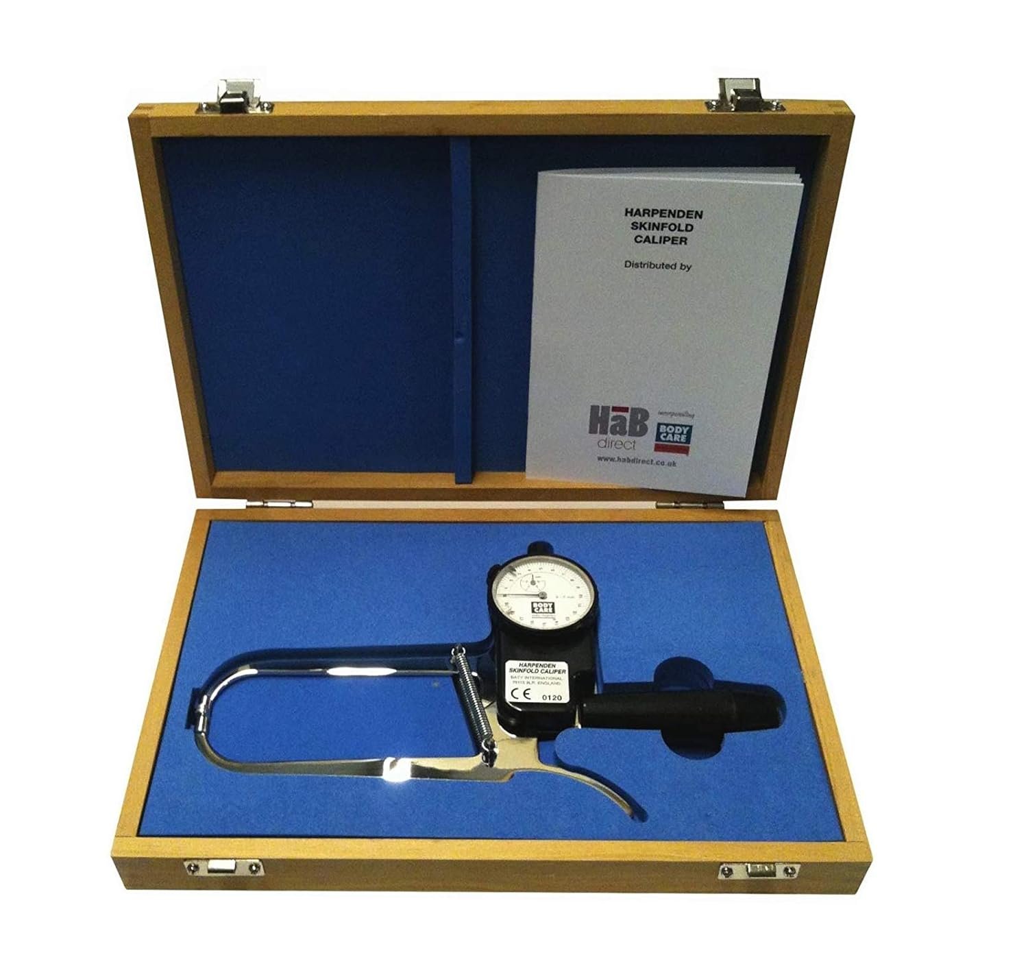 INCLUDES Harpenden skinfold caliper, calibration dowel for testing calibration, instruction manual with charts in English, and wood case.