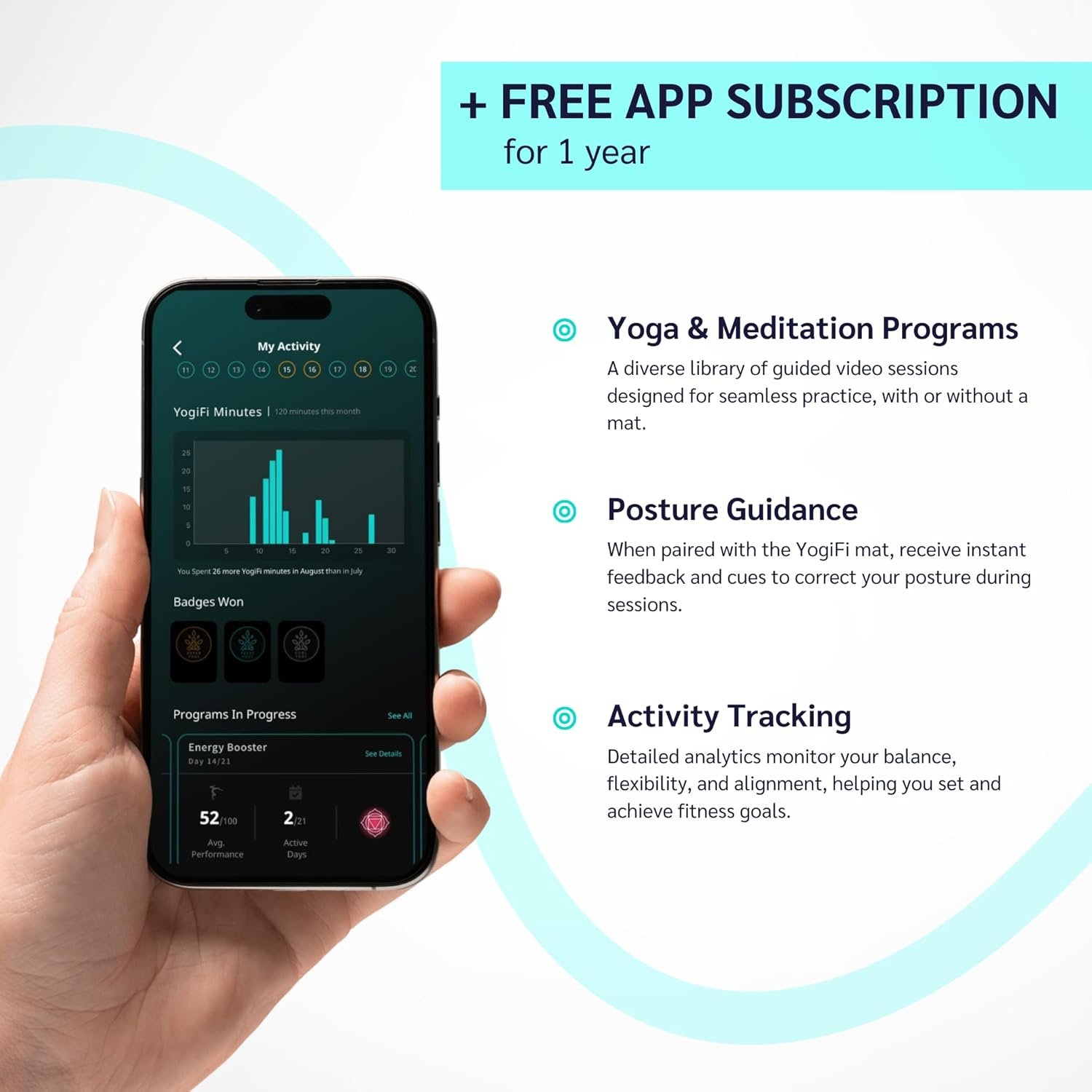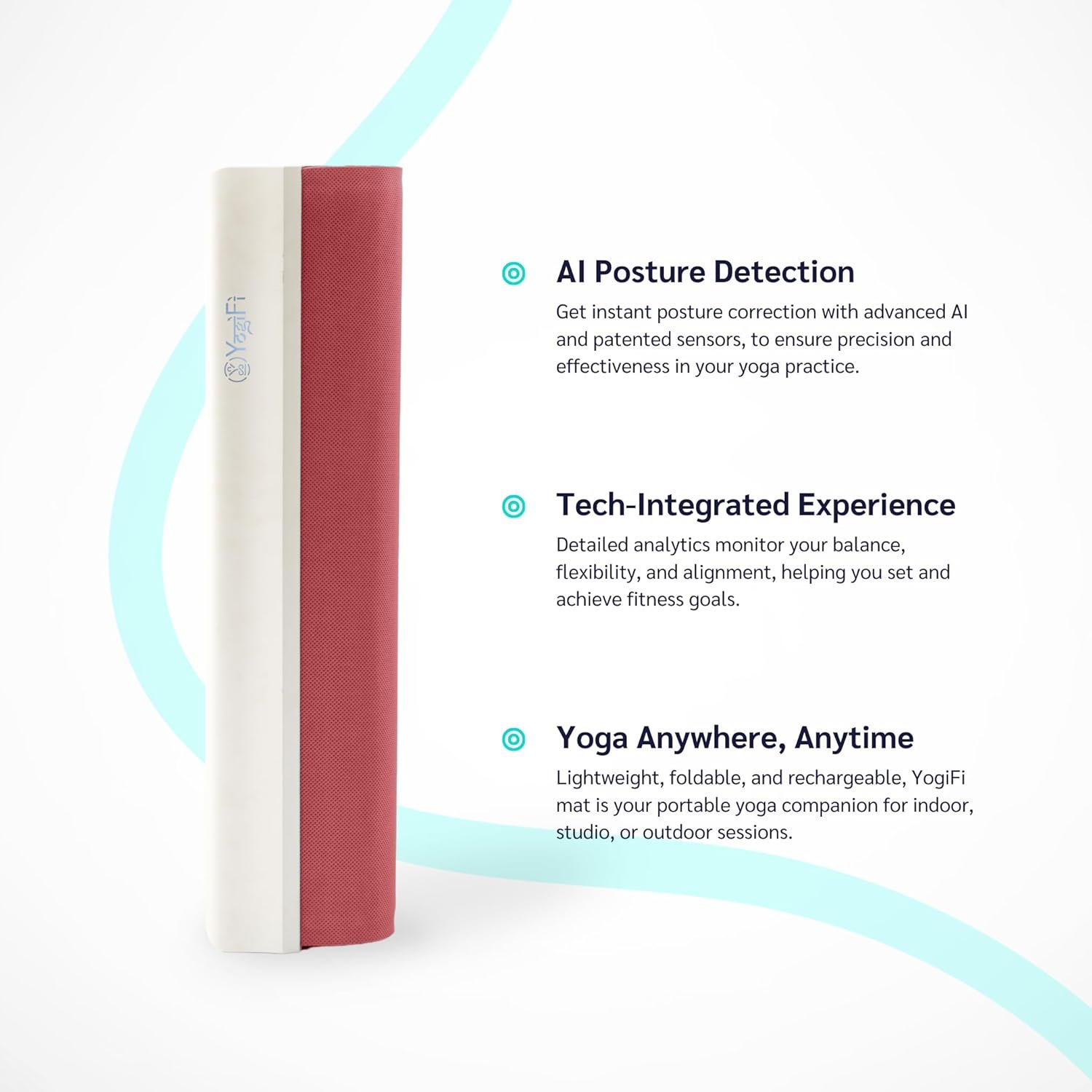 Connect to the YogiFi app for guided sessions, freestyle, progress tracking, and personalized yoga plans.