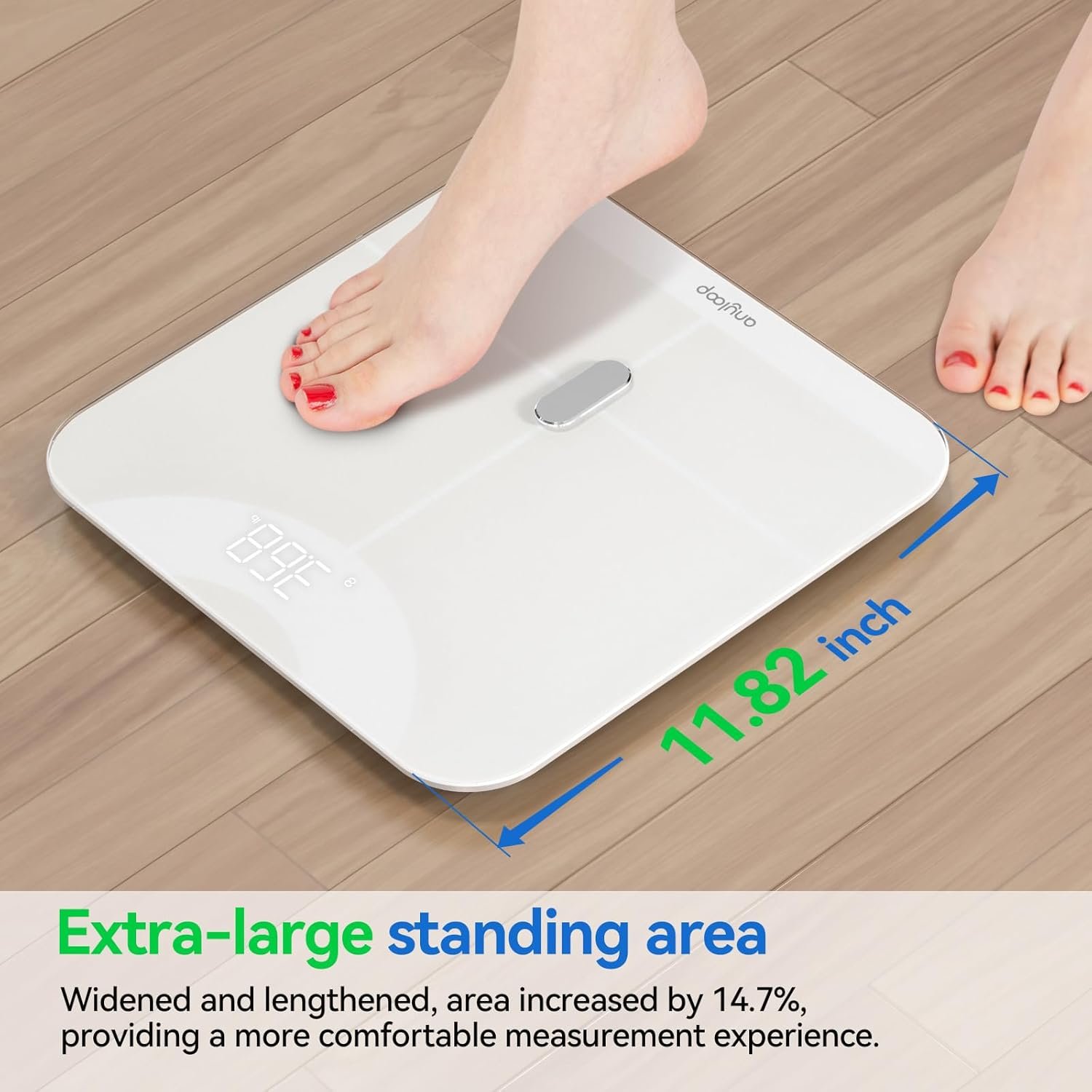 HIGH ACCURATE SMART BODY SCALE: Anyloop Bluetooth scale adopts advanced ITO coating technology with a larger sensor area, which can measure your weight, body fat, BMI, muscle mass, etc. with high accuracy and reliability, and the measurement results are accurate to 0.1 lb/0.05kg. You can trust these results to help you make informed decisions about your health.