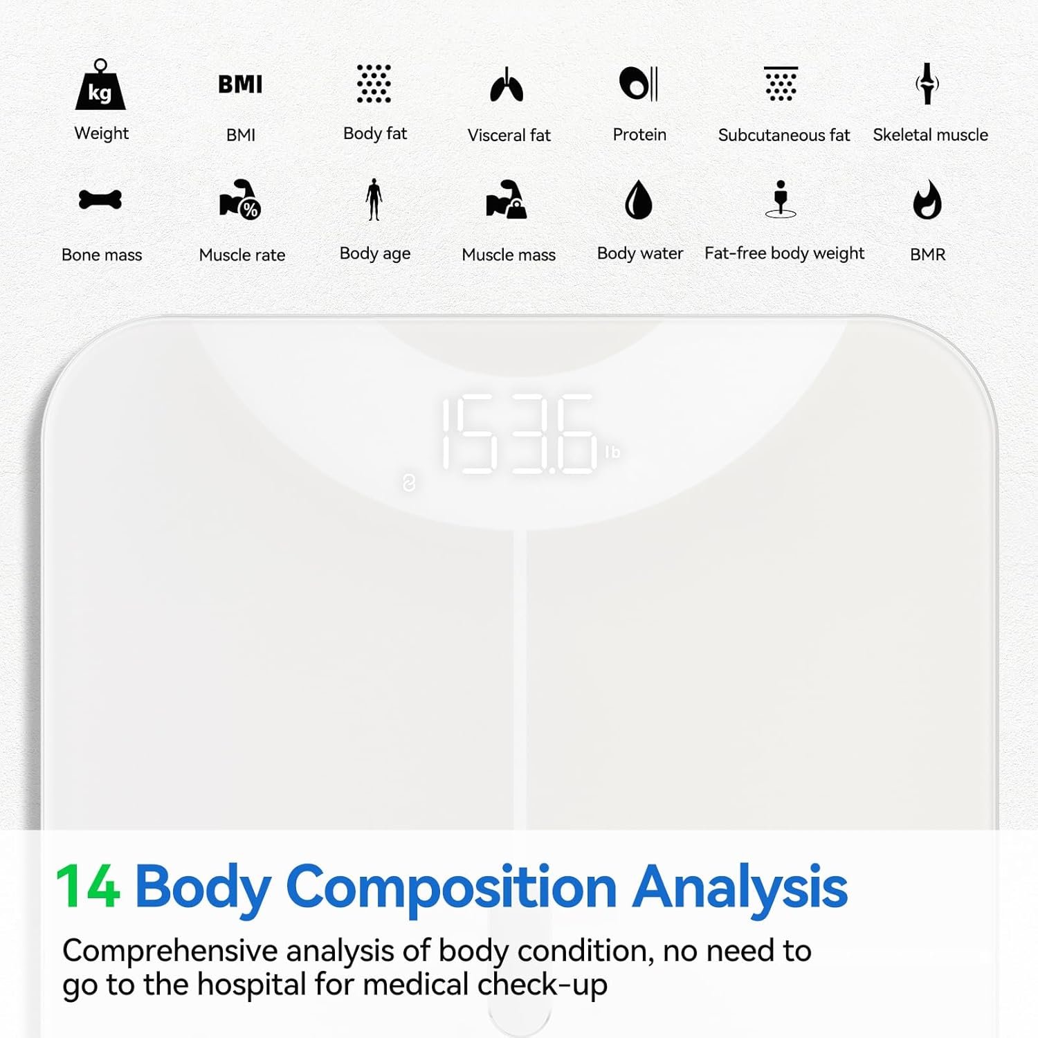 WHOLE BODY ANALYSIS: The digital bathroom scale provides a comprehensive view of your health by measuring 14 body composition indicators including body fat percentage, muscle mass and BMI. it can help you make better decisions about your diet and exercise routine, allowing you to reach your fitness goals faster.
