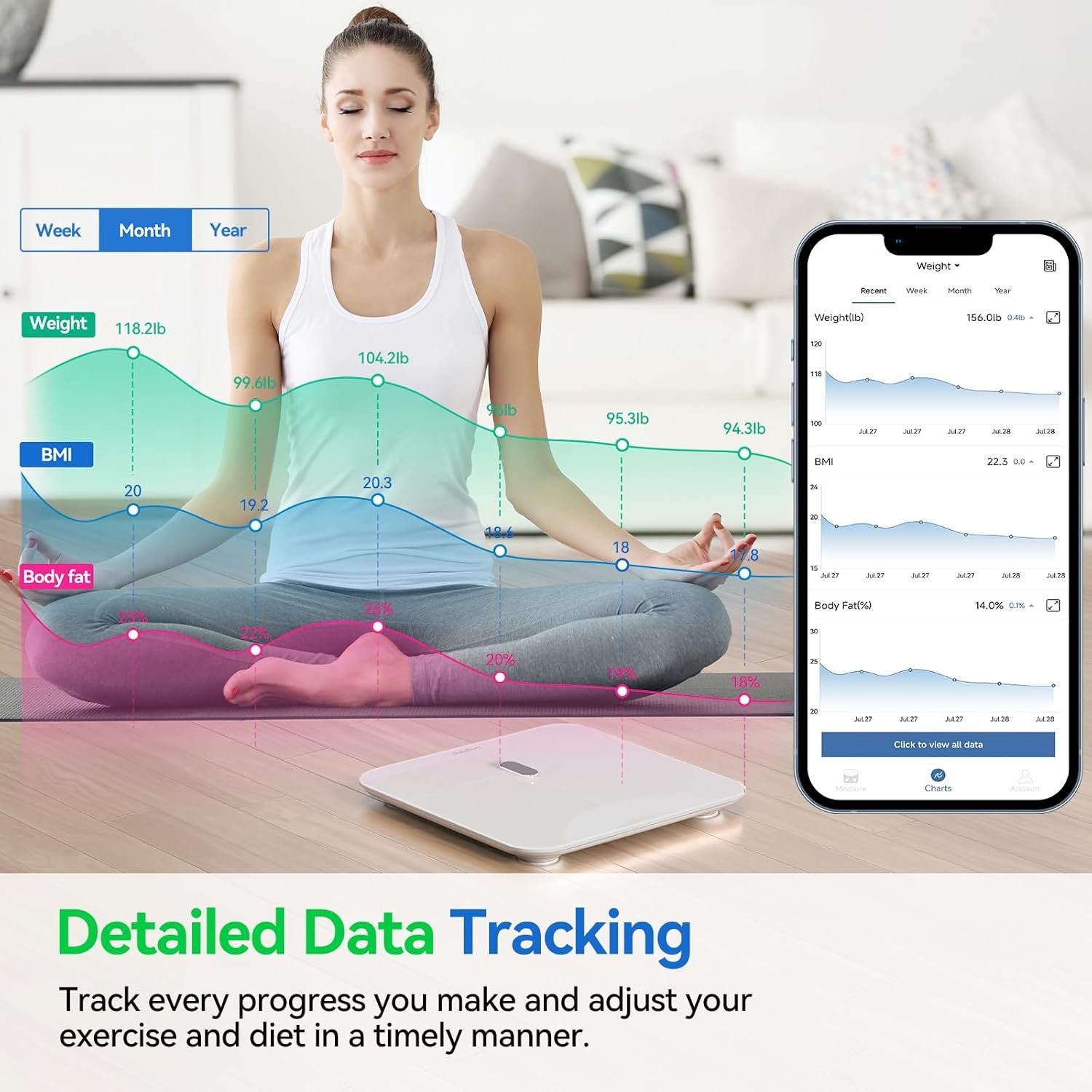 COMPATIBLE WITH POPULAR HEALTH APPS: Download the “Fitdays” app from the Apple Store or Google Play. The app provides detailed graphs and trends of 14 body composition indicators over days, weeks, months and even years. The body weight scale also easily syncs your health data with Apple Health, Google Fit and other popular fitness apps. Rest assured, “Fitdays” app will not share your information with any third parties