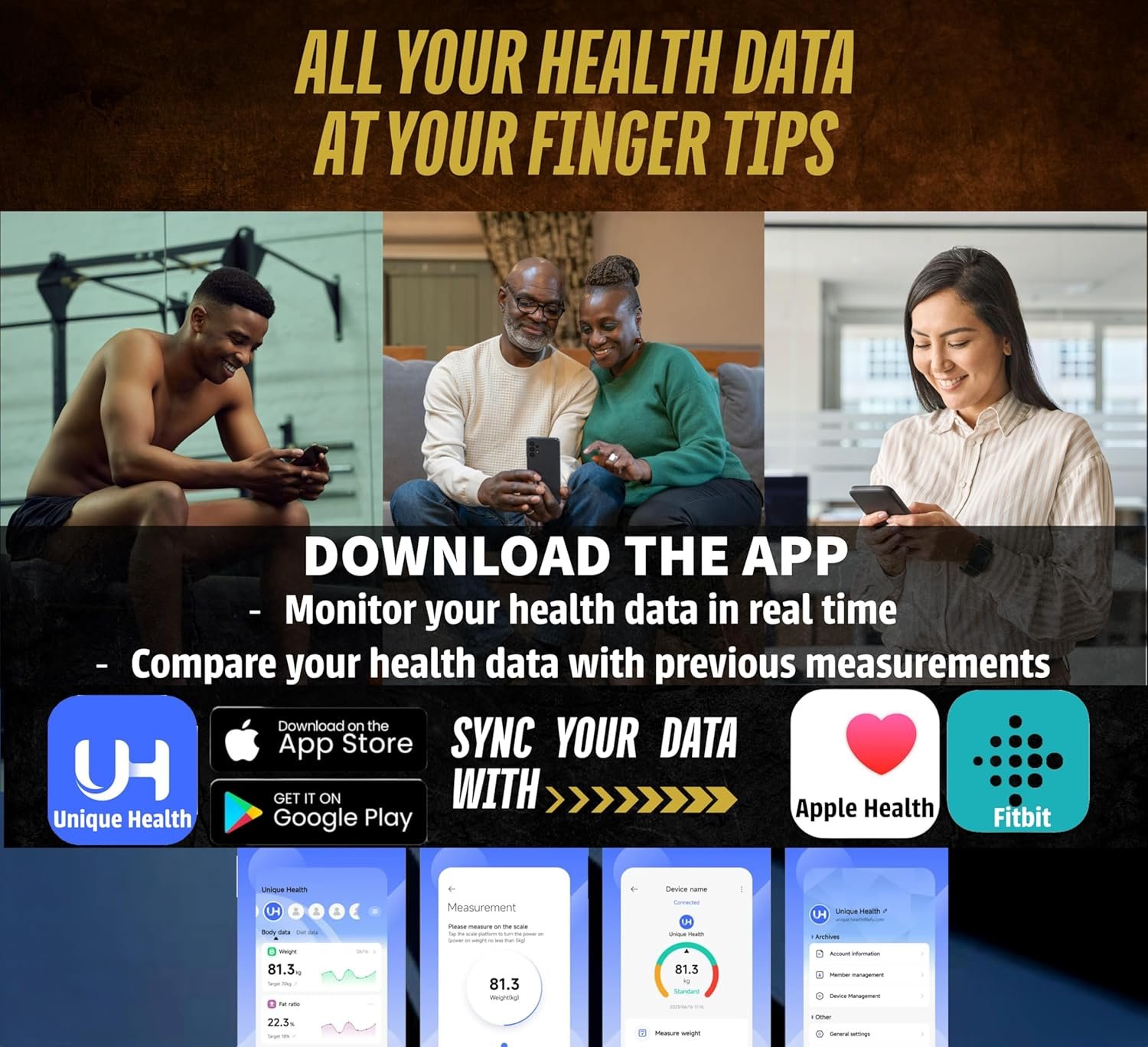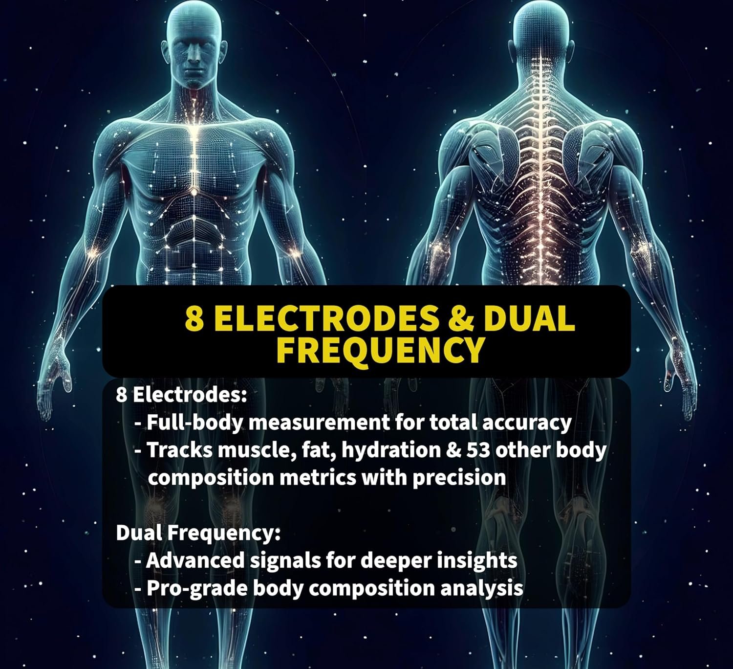 High Precision Measurement: This smart scale utilizes 8 electrodes and dual frequency technology to provide highly accurate body composition analysis, including body weight, Hydration Levels, Body Fat & Lean Mass, Muscle Mass, Body Type, Heart Rate, Metabolic Rate (BMR), Protein Levels, Bone Density, BMI, Visceral, and 44 other metrics.