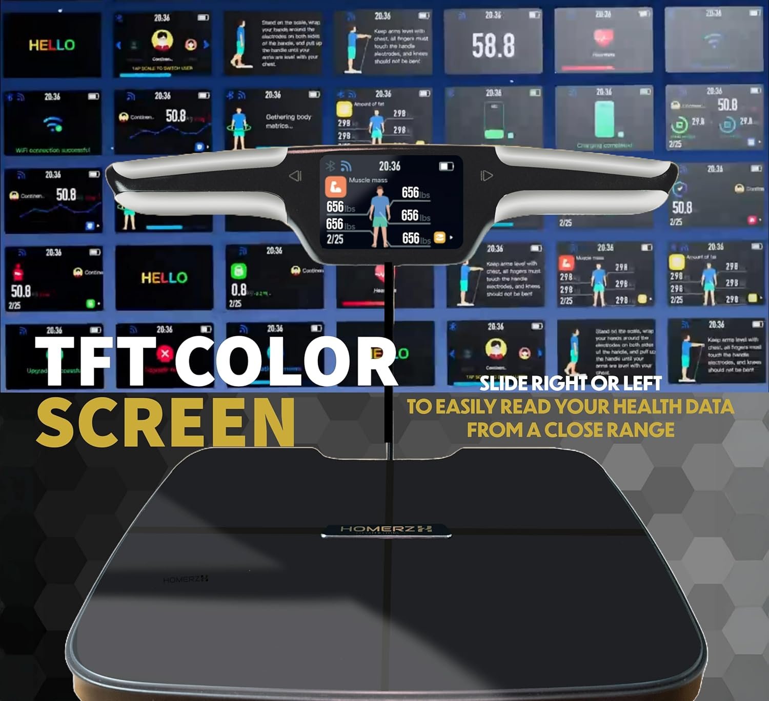 User-Friendly Display: Enjoy effortless reading with a large pull-up TFT display that clearly shows your measurements and body composition data at eye level—no more bending down or squinting to see your health metrics.