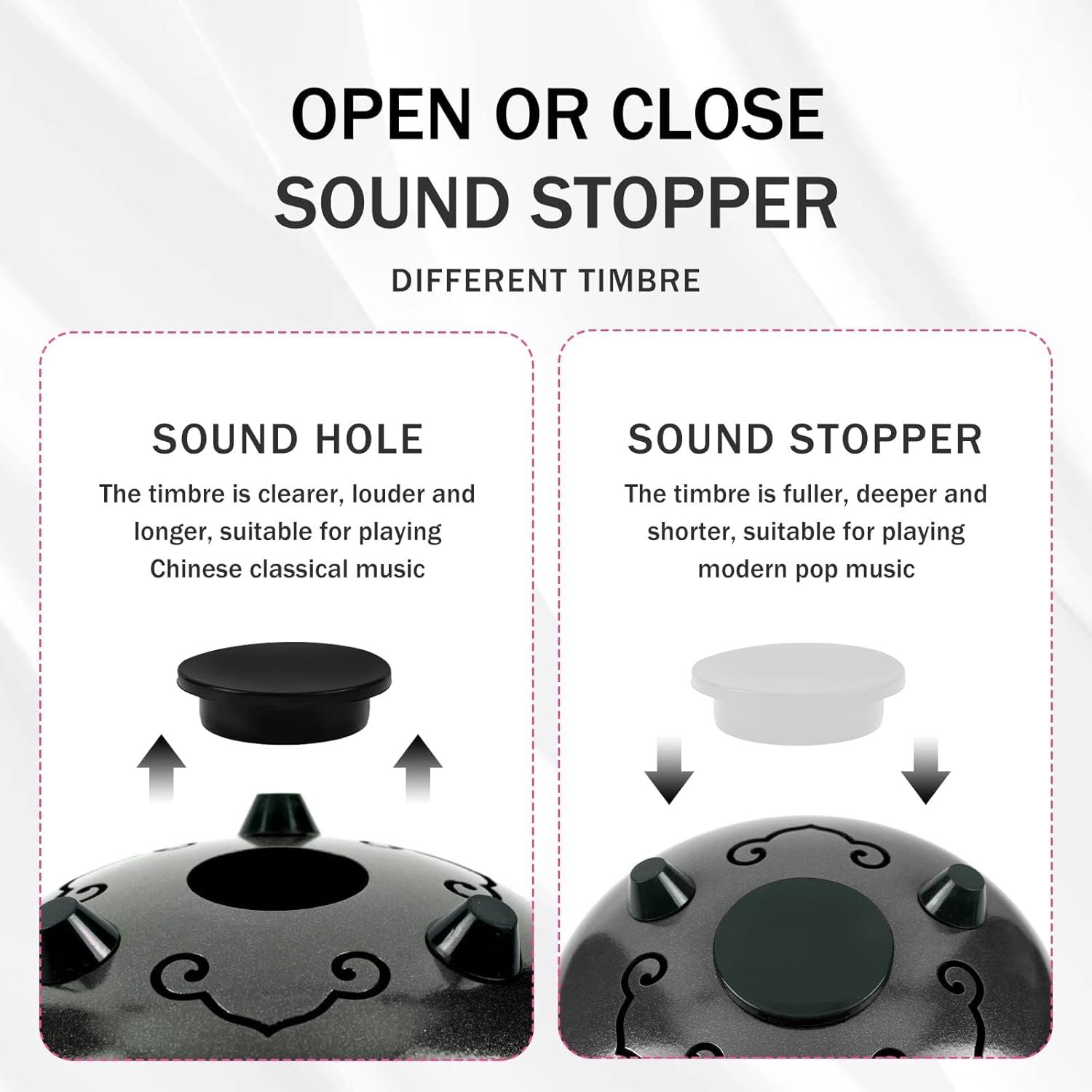 Perfect Sound, Unique Design: Standard C key and 8-note metal drum with a wide range of tones. The handpan is capable of producing a clean, ethereal, Buddha-like sound. A sound stopper on the back can change the timbre of the steel tongue drum: When sound stopper is installed, the timbre is fuller and deeper,the sustain tone is short, suitable for playing modern pop music. Remove the sound stopper, the timbre is clearer, louder and longer, suitable for playing classical music