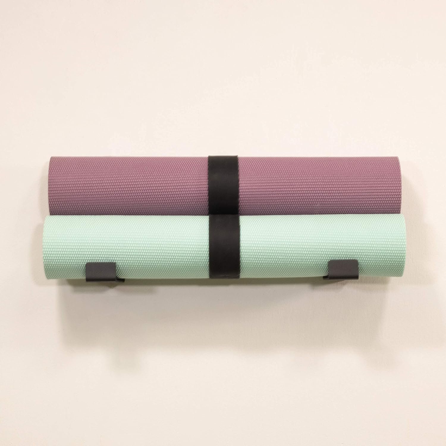 ORGANIZED STORAGE: Wall mounted rack holds yoga mats, foam rollers, jump ropes, and resistance bands!