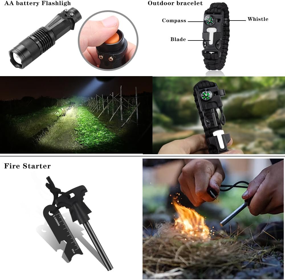 【Professional Emergency Survival Kit】It might be a lifesaver while you are stuck on the wild road, needing a fire in the jungle, needing warm in cold conditions, getting lost on a rainy day, in disaster, and any other emergencies. These camping accessories are sturdy and durable, can meet the various complex environment of outdoor survival, at the same time make you more confident to face the various crises at outdoor camping adventure ;