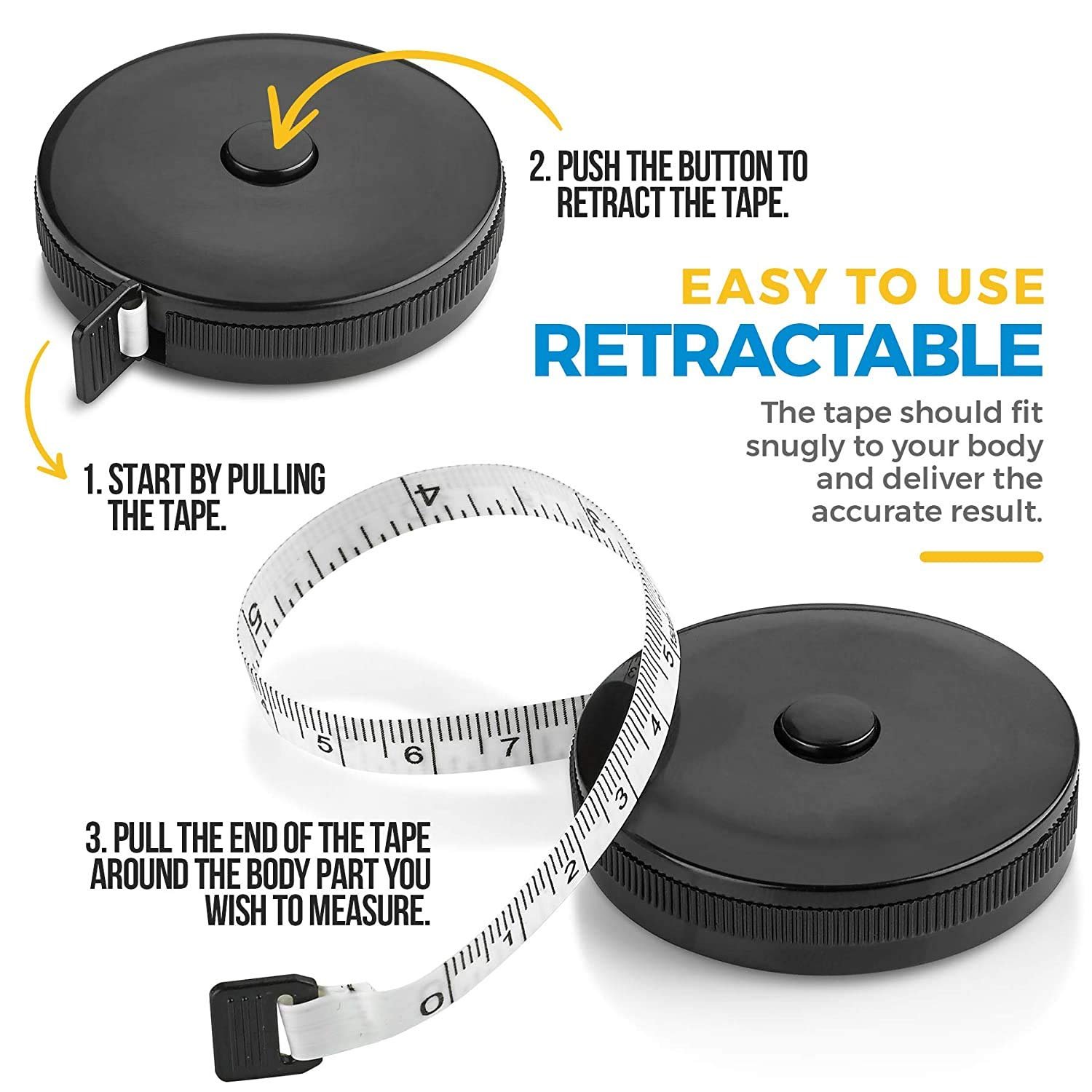 INCHES & CENTIMETERS! INNOVATIVE DESIGN: The retractable mechanism with pin lock takes away the guesswork when you use other body measuring tapes. Pull the tape out of the retractable case then place it around the waist or other area. Attach and lock the end to the holder and push the button to retract the tape. The tape should fit snugly to your body and deliver the accurate result