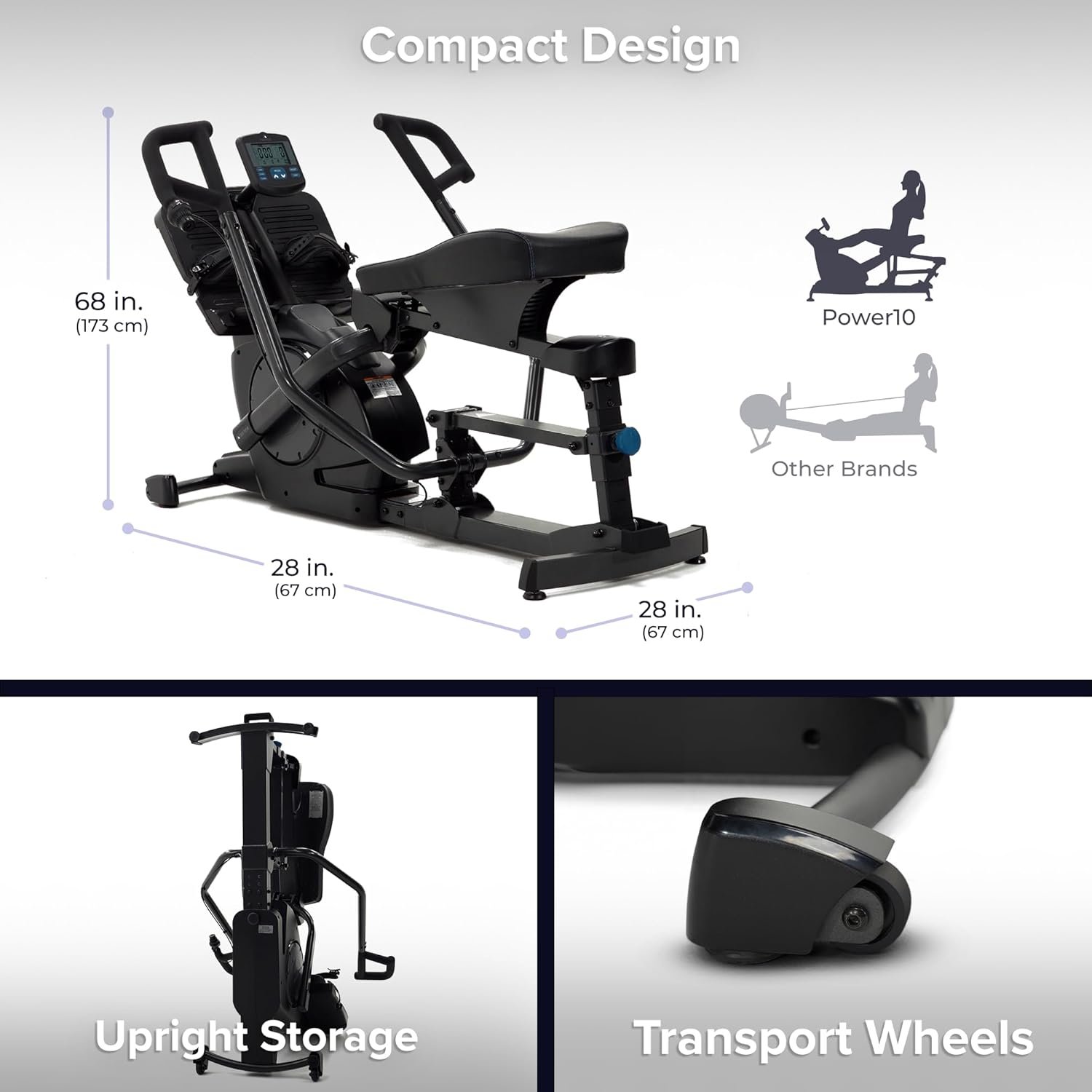 COMPACT DESIGN & EASY STORAGE: No extra-long slide rail needed – the unique wheel and fork design maintains a compact motion and takes up less room than other rowing machines. Transport wheels make moving and storage easy.