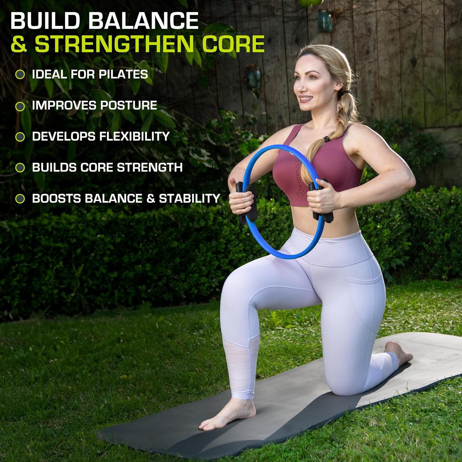 The ProsourceFit Pilates Resistance Ring adds a new challenge and heightened strength-training to classic Pilates mat workouts. The lightweight circle provides gentle resistance to help tone your core, as well as the small, hard-to-target muscles through-out your entire body. The unique design is ideal for rehabilitation exercises, those new to working out and learning to activate the proper muscles during workouts and anyone who wants to progress in their Pilates practice. The 14-inch toning ring helps improve balance and causes muscles to adapt and become stronger, making it great for both general conditioning and physical therapy. Foam handles on each side make it comfortable to hold in your hands or between the feet or knees. It’s perfect for gently toning thighs, arms, back, chest and core while doing exercises like bridges, boat pose, roll-ups, side presses and much more. The sturdy steel “magic circle” is covered in durable rubber, so you can twist, turn and squeeze it, yet the shape will hold. Available in 4 colors, suitable for men and women. .