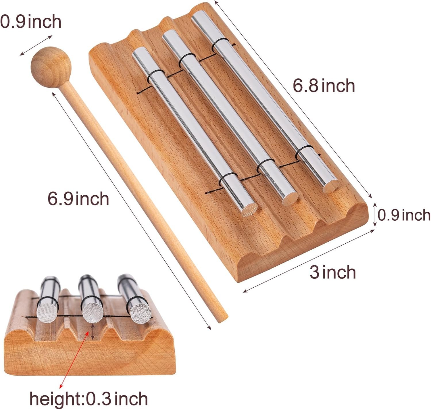 Experience the soothing “Ding” sound produced by three aluminum rods on a wooden base, creating a calming atmosphere that aids in stress relief and chakra healing.