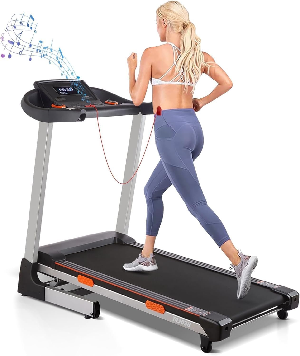 【Comfortable Running Experience】Connect the folding treadmill to your phone through Bluetooth, so you can play music while you are exercising. The 3.5 peak HP drive motor can provide stable speeds of 0.62-8.7 MPH with special bearing low noise. Let you enjoy the fun of indoor running in a quiet environment without disturbing others. The treadmill with incline supports max user weight 300 pounds, suitable for most people.