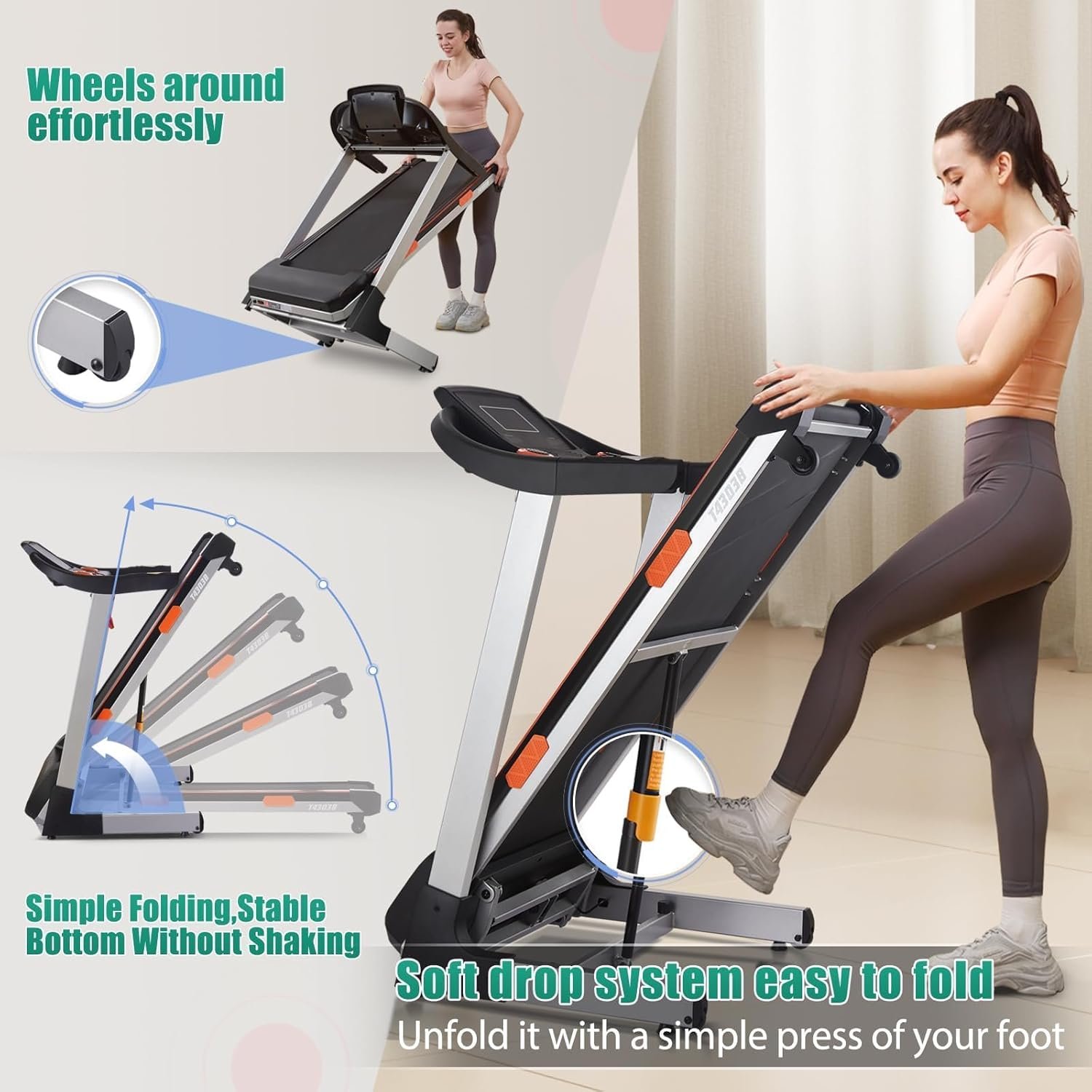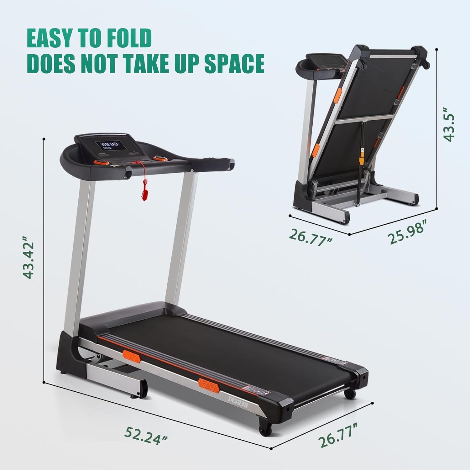 【Easy Assemble & Space Saver】 Quite easy to assemble the treadmill. Only one person can fold up the incline treadmill in a few seconds after finishing your workout and approximately 40% space could be saved. Our soft-drop system eliminates any risk of accidentally dropping the treadmill base and damaging your floors. Just Kick the switch lightly, and the foldable treadmill runway will descend automatically and slowly , convenient & safe. Folded Size: 25.98” x 26.77” x 43.5”.