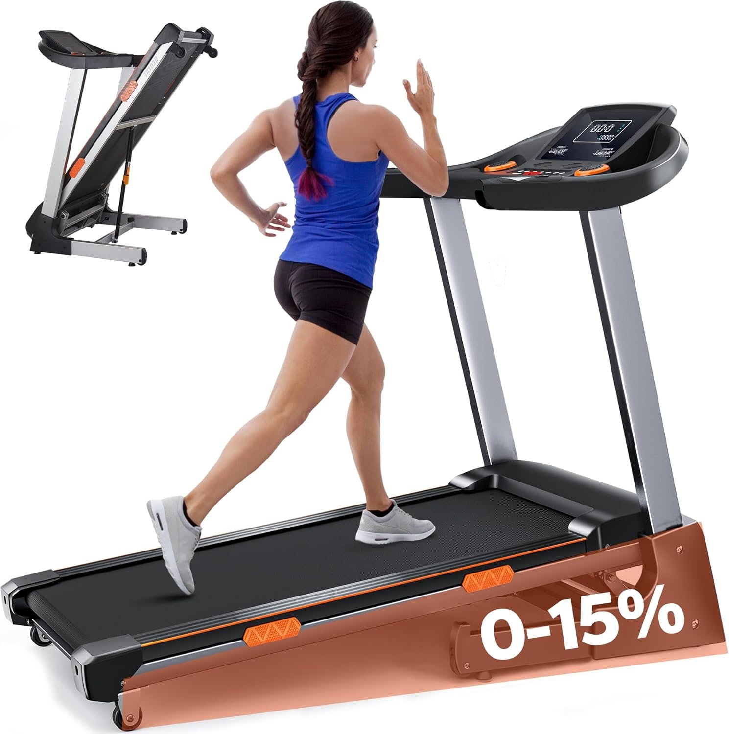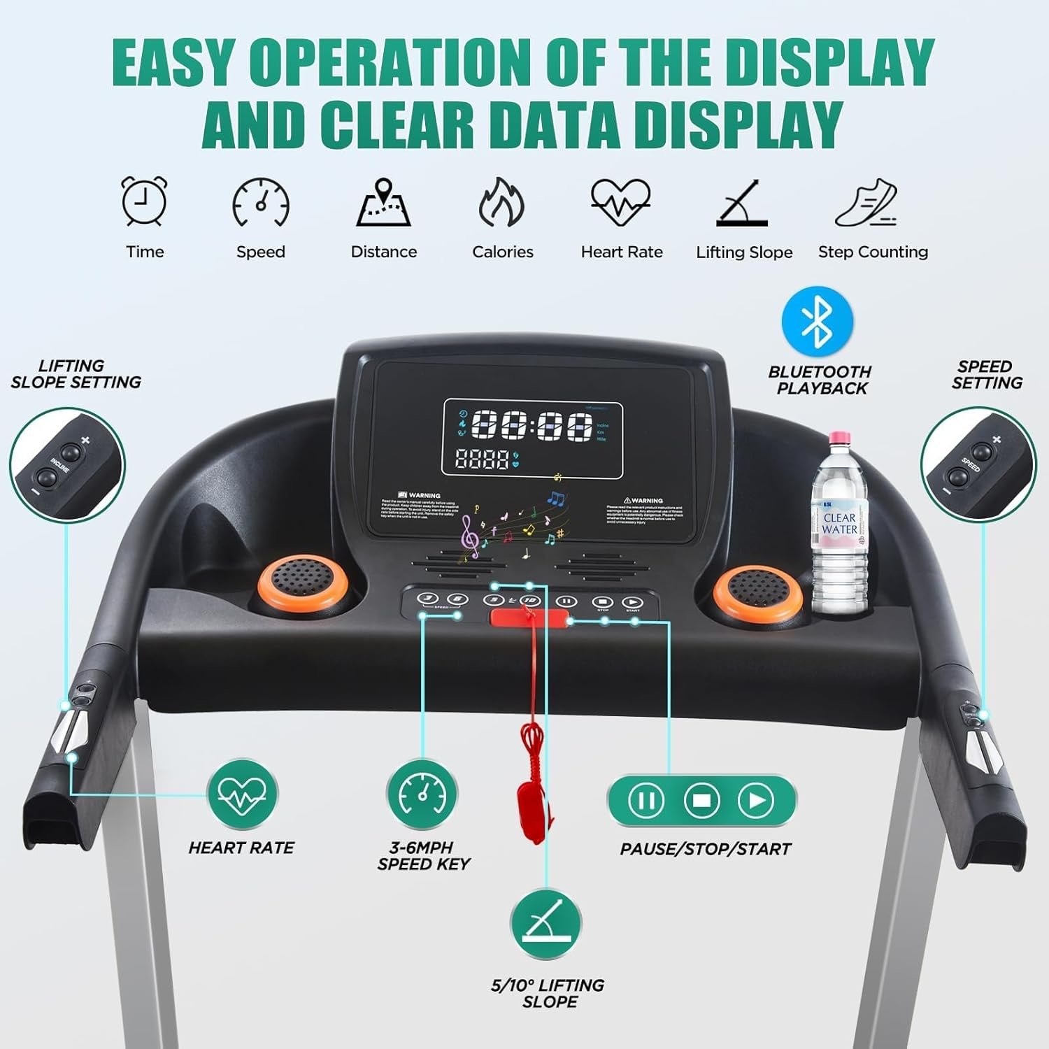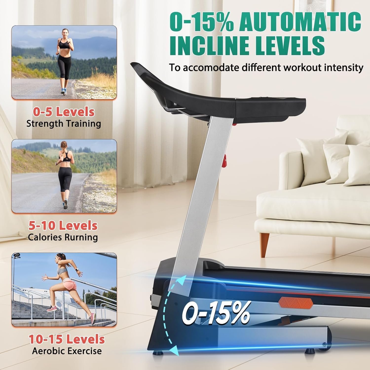 【0-15° Auto Adjustable Incline】Our electric treadmill is equipped with (0-15%) automatic incline and with the acceleration/ deceleration buttons built-in armrest controls to adjust the running speed and incline easily. Improve your cardio routine by 0-15° recline levels creating plenty of resistance to achieve a maximum burn at any time. The quick buttons allow you to quickly adjust recline automatically to levels 5-10-15.