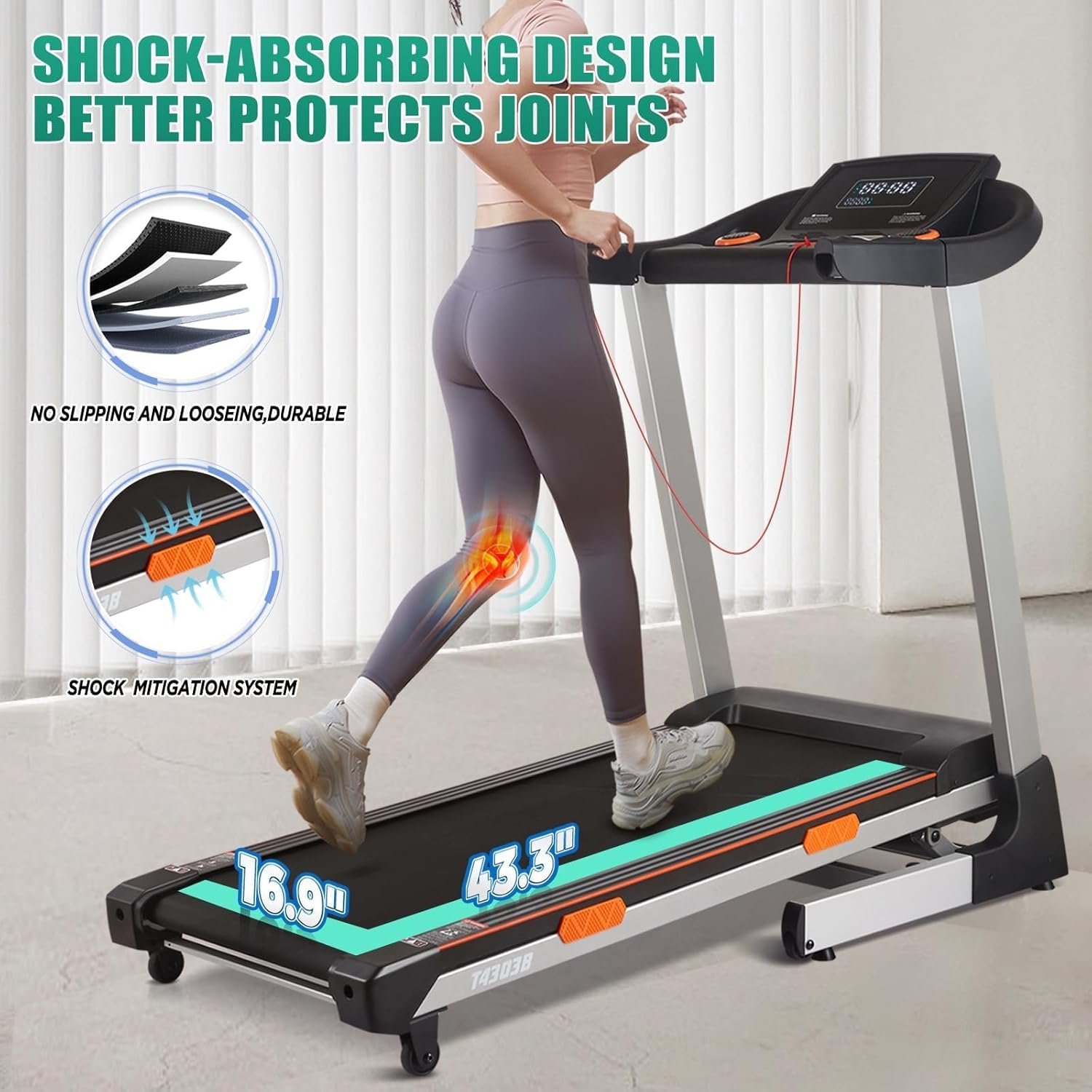 【Wider Running Belt】16.9” wide 8-layer non-slip texture belt is made of PVC + polyester fiber + cotton yarn, extremely flexible and comfortable. The shock absorbing running belt, providing an effective and safe cushion for your knees and muscles when running. 43.3″ long running belt size of the incline treadmill provides ample workout space.