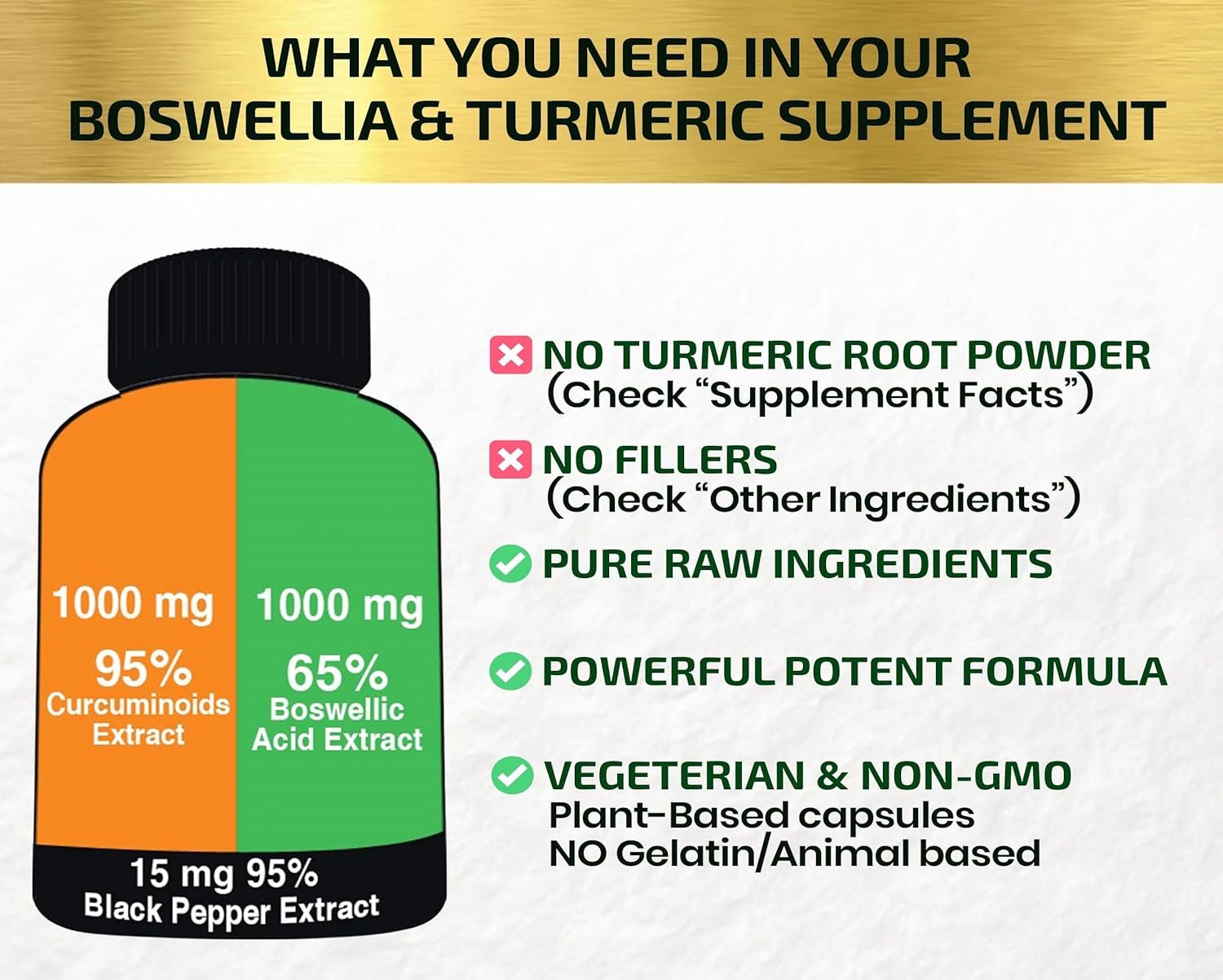 BEST AVALABLE TURMERIC BOSWELLIA SUPPLEMENT ✔ In order to be effective, our Highest Potency Turmeric Boswellia Complex consists of 2000 mg pure standardized 95% Curcuminoids extract & 65% Boswellic Acids. This is a MUST for Real Results! It’s a Much Stronger than other brands that contain turmeric root powder. Our powerful Extract of Boswellia Turmeric Curcumin with black pepper is formulated for maximum absorption & bioavailability of nutrients.