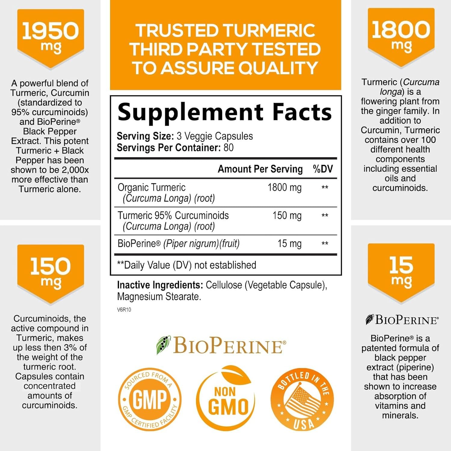 WITH BIOPERINE FOR MAX ABSORPTION: BioPerine, a patented black pepper extract, has been shown to improve the absorption of many herbs and spices; and provides as much as 2000x better absorption than consuming normal turmeric capsules alone