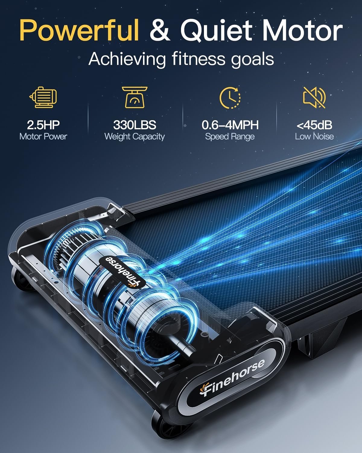 2.5HP Powerful & Quiet Motor: Finehorse Up Pad walking pad treadmill is equipped with a 2.5HP motor, which is stable and reliable, with a maximum weight capacity of 330 pounds and a speed of 0-4 mph can meet the need of exercise such as climbing, walking, jogging and running. Wireless remote control, easily adjust to the appropriate slope