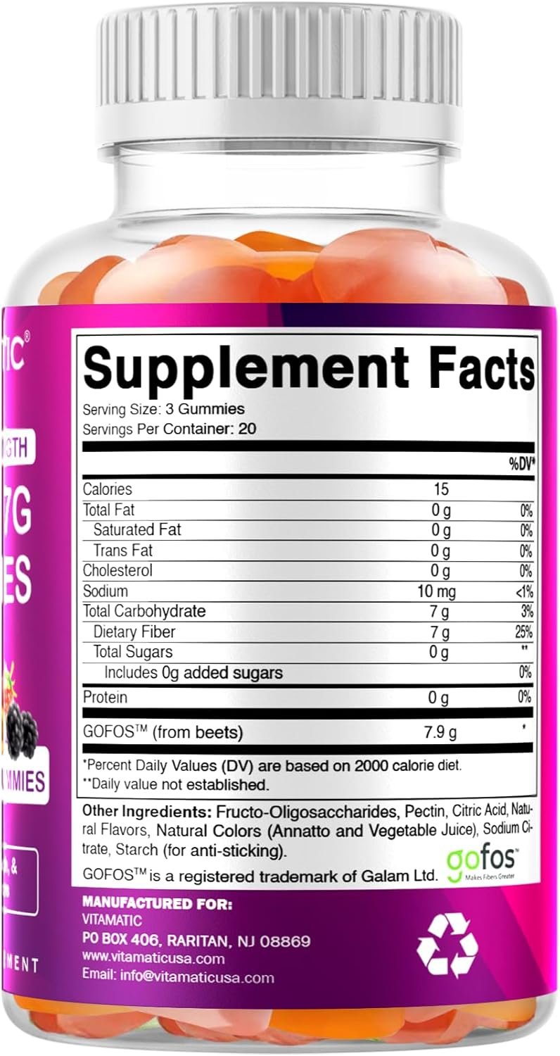 2 Pack Vitamatic Prebiotic Fiber Gummies for Adults – 7G Fiber Extra Strength – Zero Sugar Added – 60 Pectin Based Gummies – Digestive Health & Regularity Support
