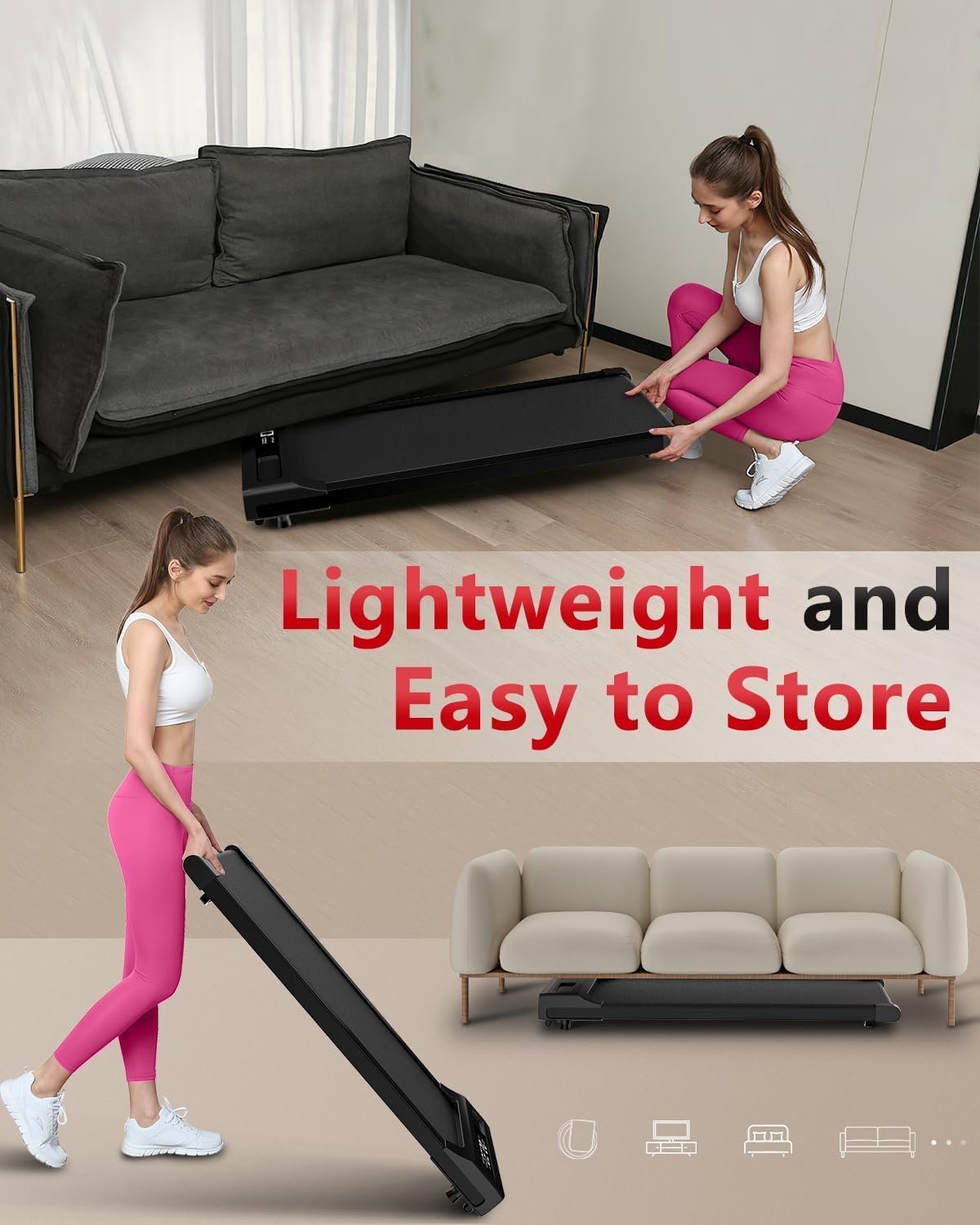 Walking Pad Treadmill: Walking pad treadmill measures 44 “D x 20 ‘W x 4.4 ’H, Walking pad can be easily stored and move vertically under your desk, bed, or sofa with transport Wheels. Equipped with a 2.5HP powerful & quiet motor, very suitable for home or office use