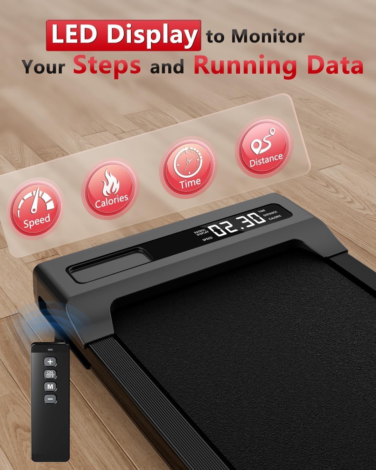 LED Display and Remote Control: The desk treadmill is equipped with a LED diaplay and a remote control that displays key workout information: speed, distance, time, and calories burned. This portable treadmill can accurately help you calculate the exercise time and calories consumed