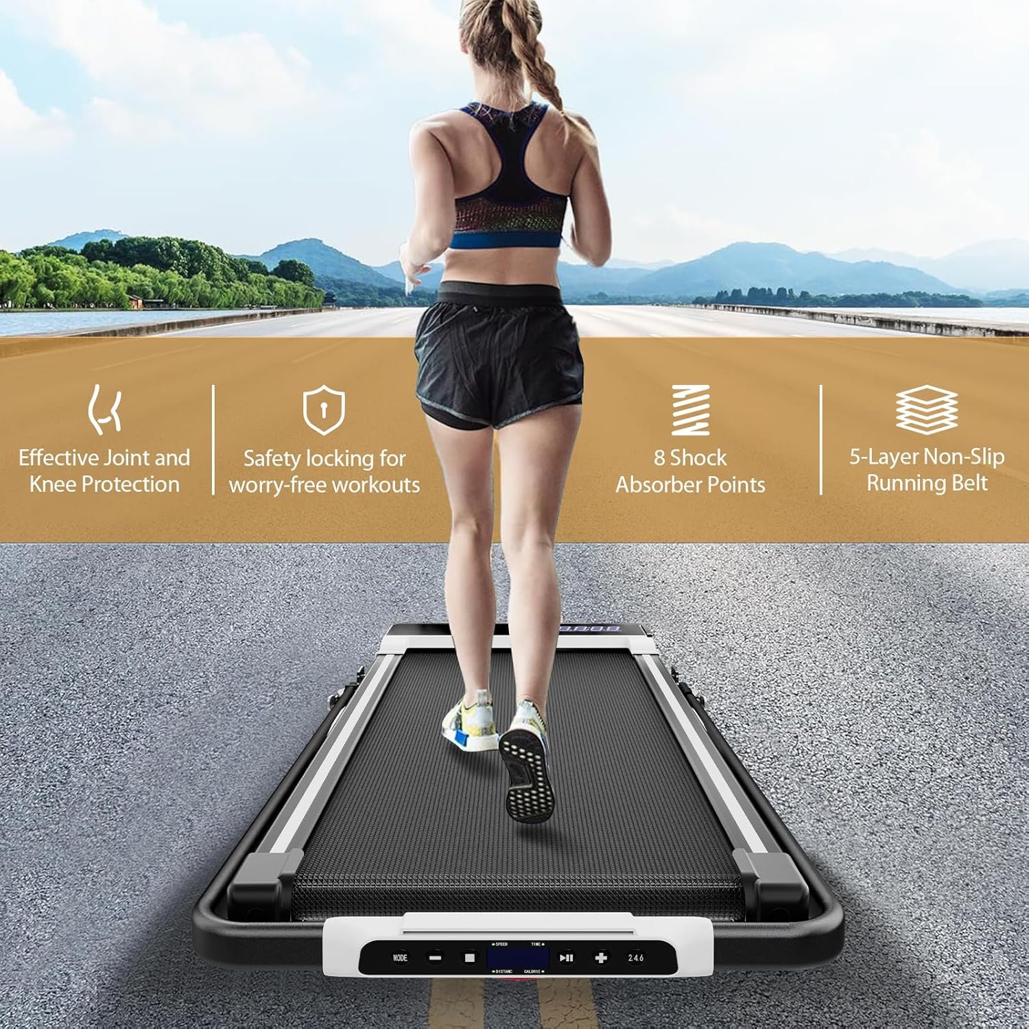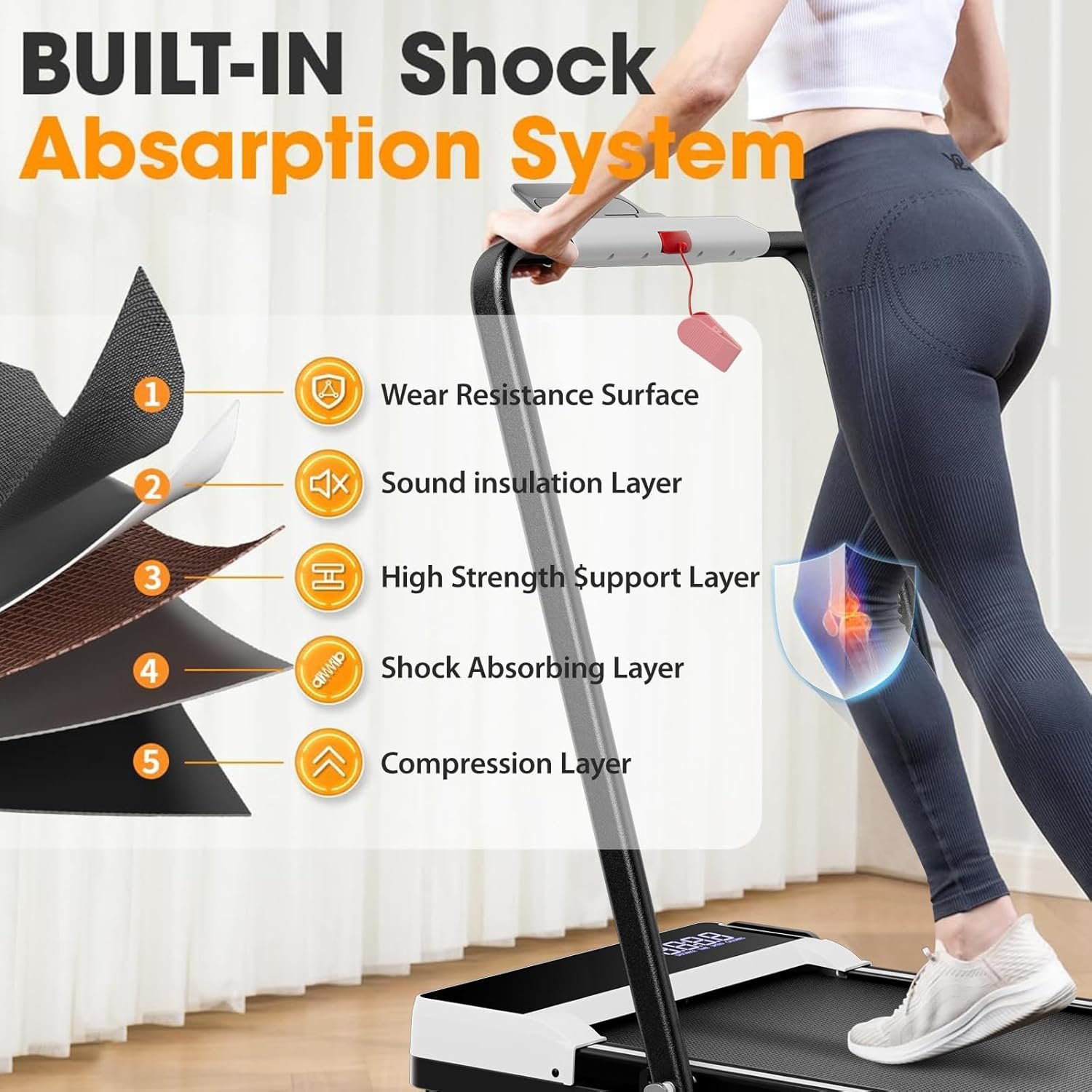 【Non-Slip Running Belt & Shock Reduction System】The 5-layer anti-slip running belt and shock-absorbing column support design can greatly absorb the impact caused by exercise and provide protection for knees, muscles and ankles. Walking pad under desk treadmill uses a turf textured running belt with a shock-absorbing and anti-slip design, which can maintain its wear-resistant properties even under long-term and high-frequency use.