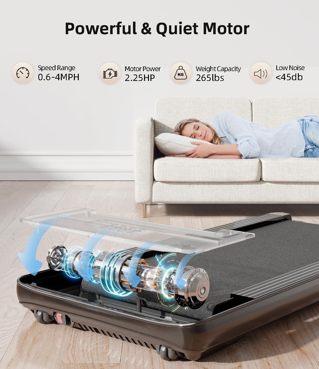 【Powerful 2.25 HP Quiet Motor】: The walking pad is equipped with a powerful 2.25HP motor. Maximum weight capacity is 265 lbs. The motor of our treadmill provides great power and is also very quiet, which makes it perfect for office and home use. You can use this under desk treadmill anytime, anywhere without worrying about disturbing others