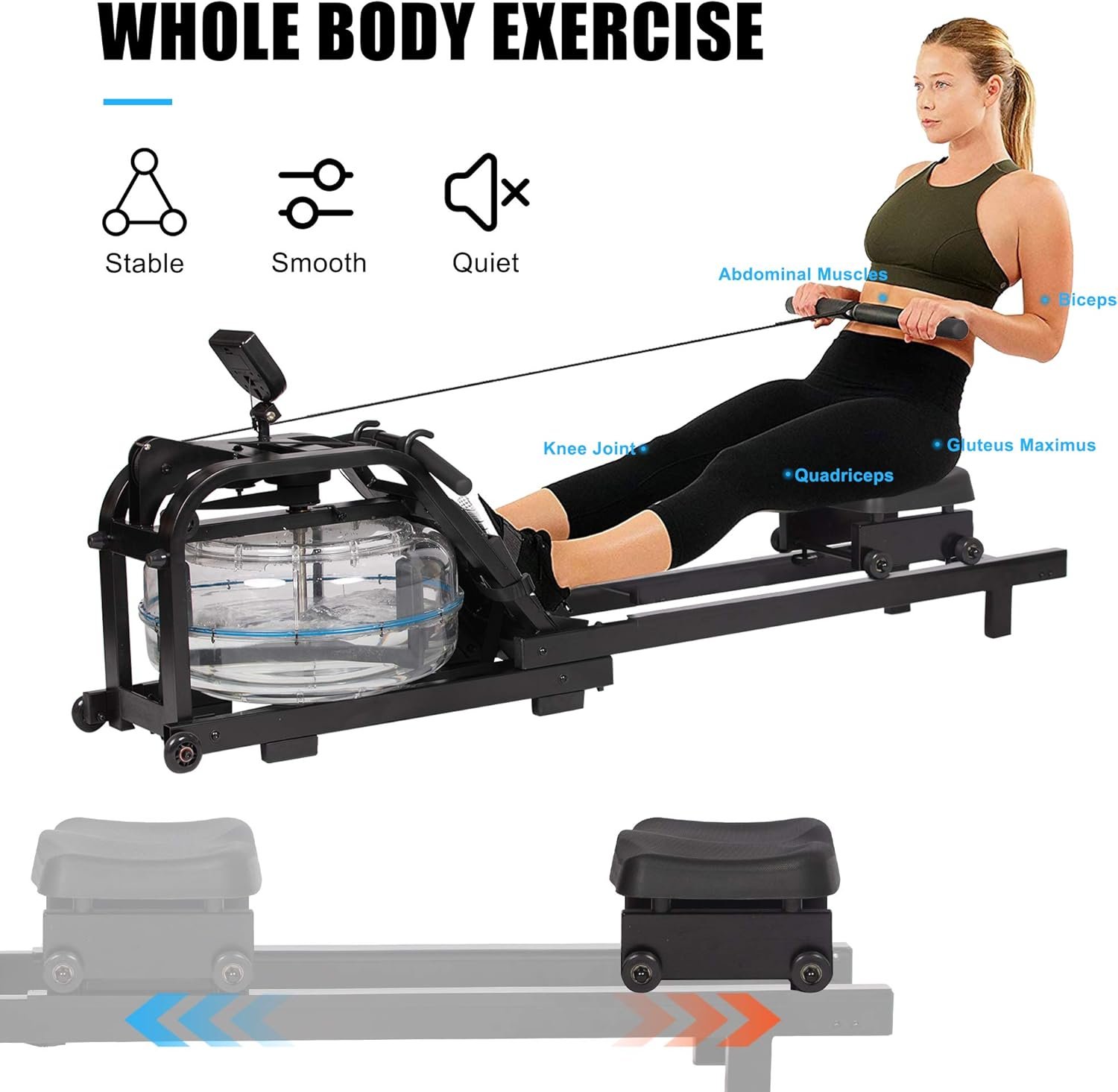 Quiet Operation | The seat glides quietly on the 44 inch slide rail, capable of providing a full low-impact workout.Listening to the sound of water and feeling of paddles cutting through the water – this was nothing less than health-giving and therapeutic.