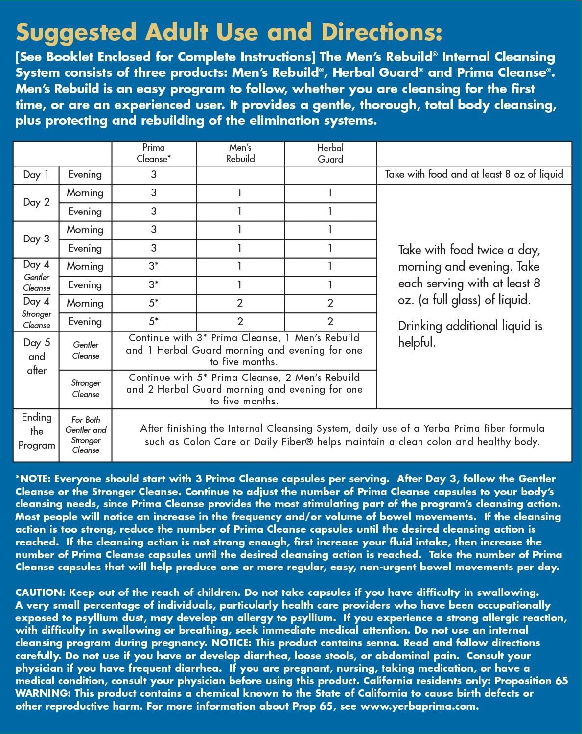 A MONTH’S SUPPLY: Gentle Whole Body Cleanse. 30-Day Supply of Fiber & Herbs designed especially for men. his kit contains Men’s Rebuild (60 Caps), Herbal Guard (60 Caps), & Prima Cleanse (180 Caps)