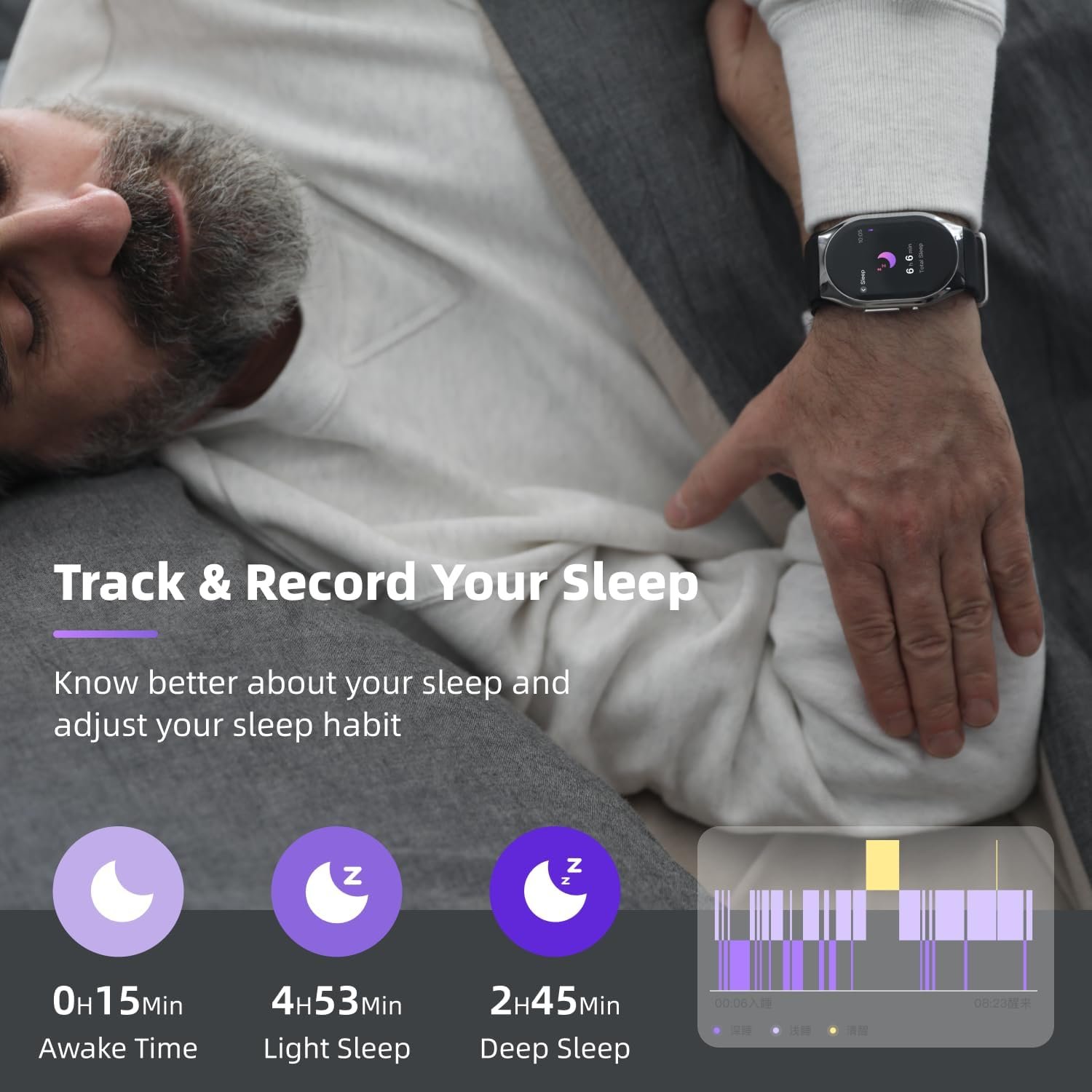 ⌚【Comprehensive Sleep Monitoring and Analysis】Equipped with a high-precision sleep monitoring sensor, this sleep tracker can monitor sleep quality accurately, including deep sleep, light sleep, awake periods, effectively helping you improve your sleeping habits and quality. As a smart helper,it also works as a drink reminder, stress tester,breathe coach,guard your health from all aspects.