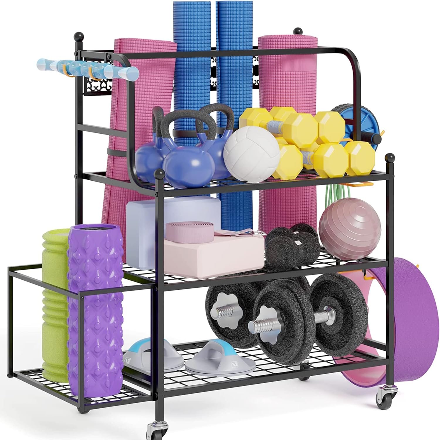 Extra Large Capacity: This yoga mat holder workout storage rack has 3 layers of dumbbell storage racks, a side basket for the yoga mat and foam roller, and several side storage hangers for storing resistance bands and roller wheels