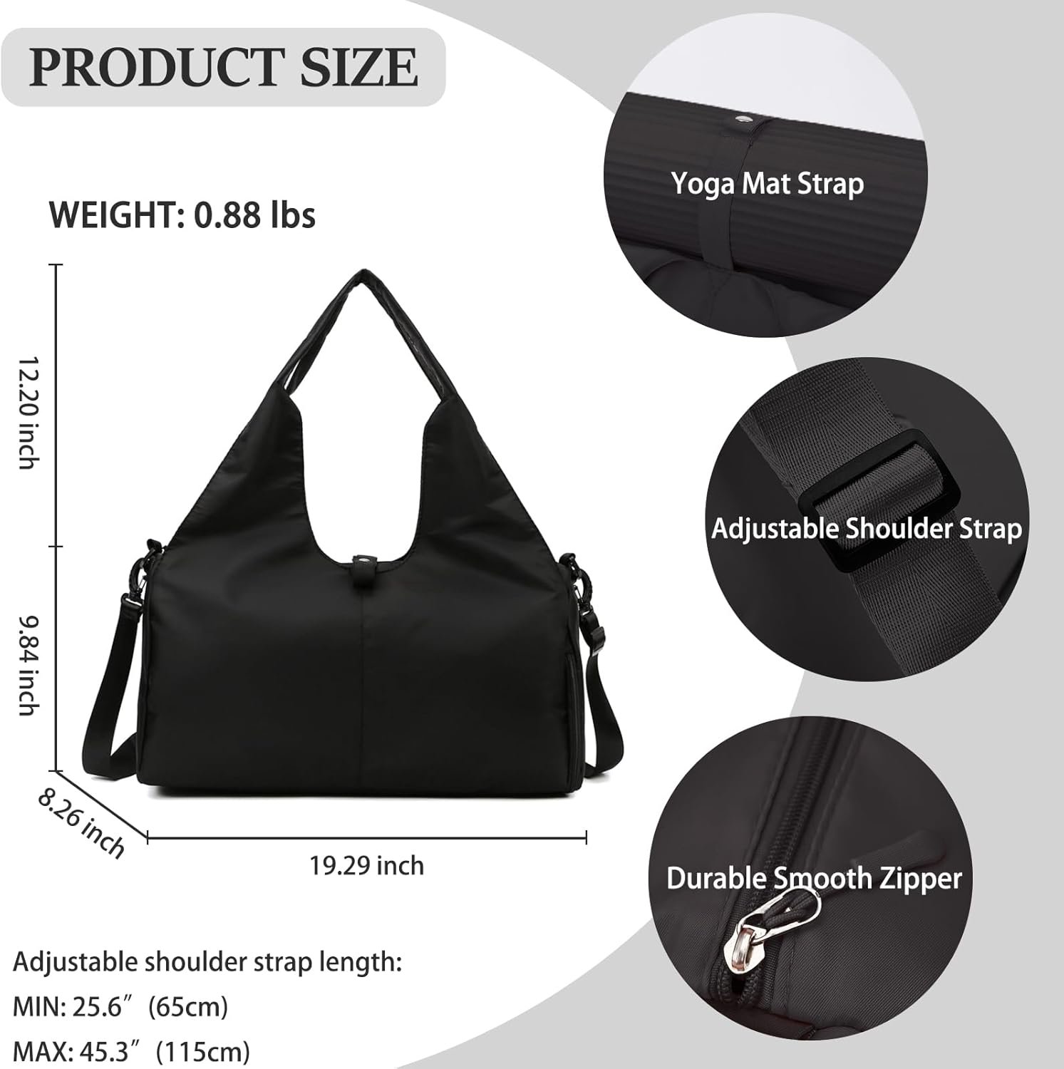 LARGE YOGA MAT BAGS FOR WOMEN: This yoga bag has plenty of storage space for all your yoga essentials! Size: 19.29 x 8..26 x 9.84 inches (L*H*W). Weight: 0.88 lbs. You can put towels, clothes, yoga blocks, water cups and everything you need for women’s yoga accessories